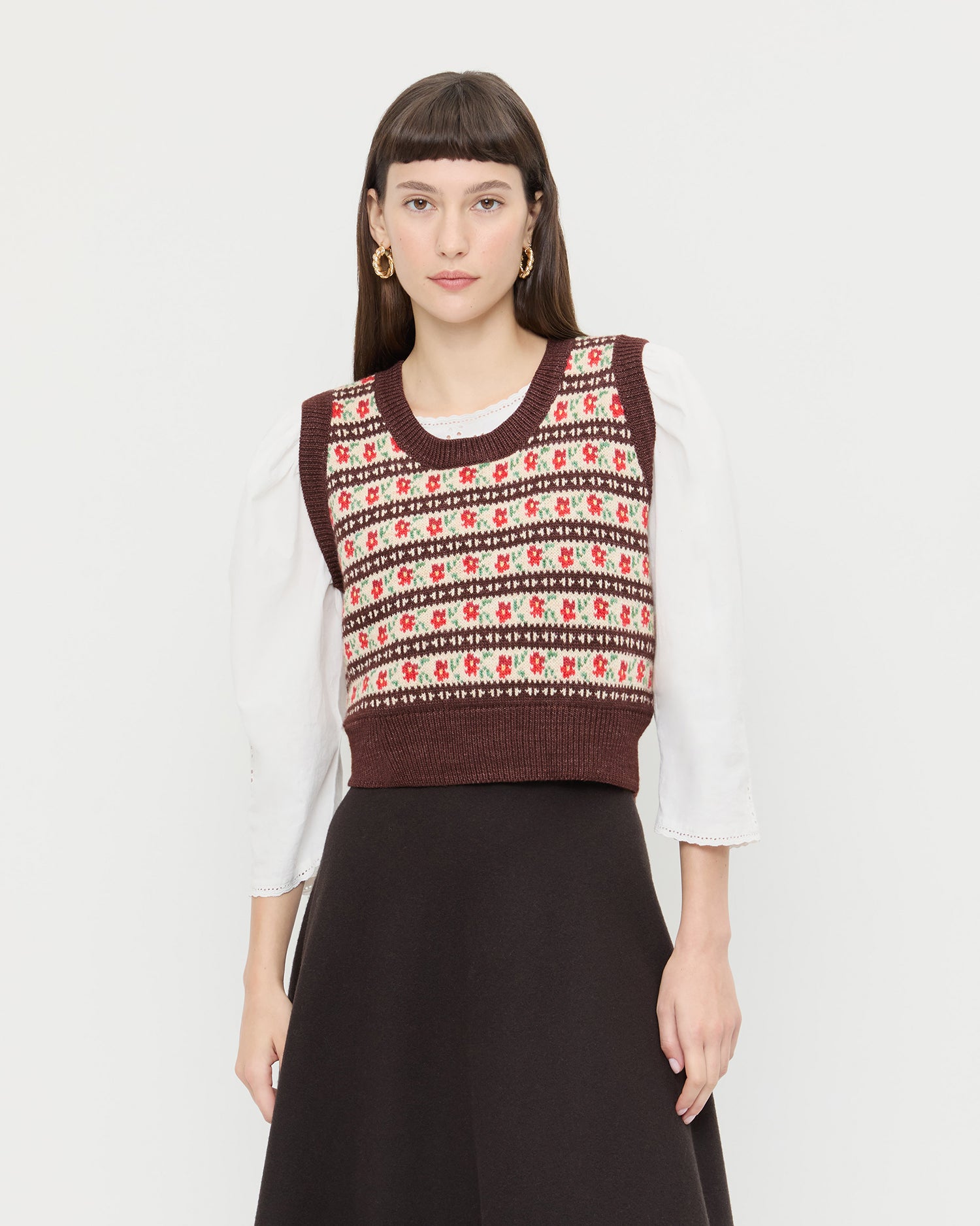 Heather Sweater Vest in brown and red intarsia floral, Felicity Blouse in cream cotton, and Tansy Suede Skirt in brown suede.