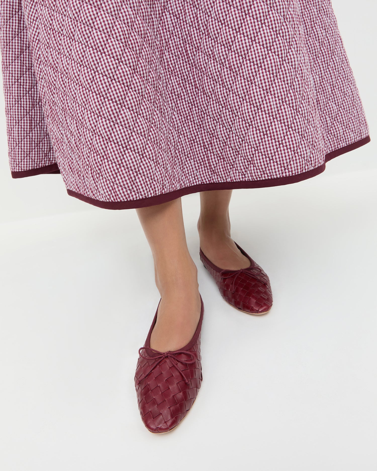 Landry Wine Woven Ballet Flat in red wine woven leather and Clara Quilted Skirt in maroon gingham.