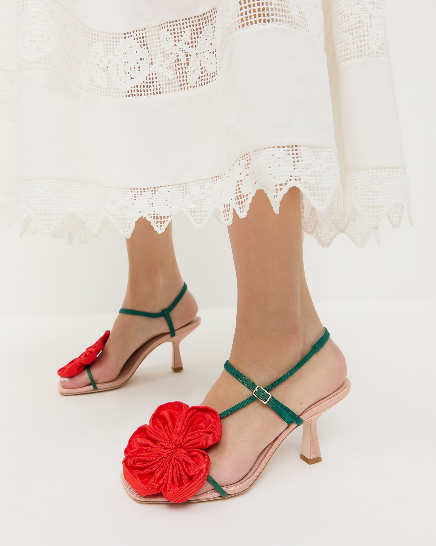 Frank Red/Green Moiré Flower Sandal in red and green moiré and Poppy Lace Dress in white cotton.