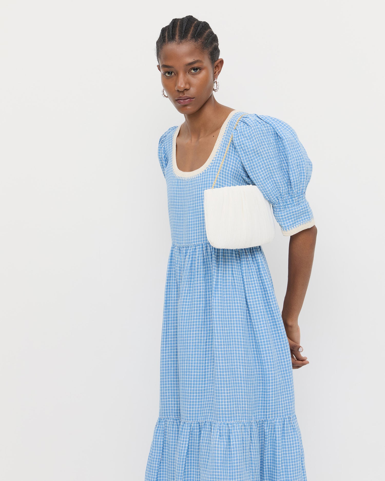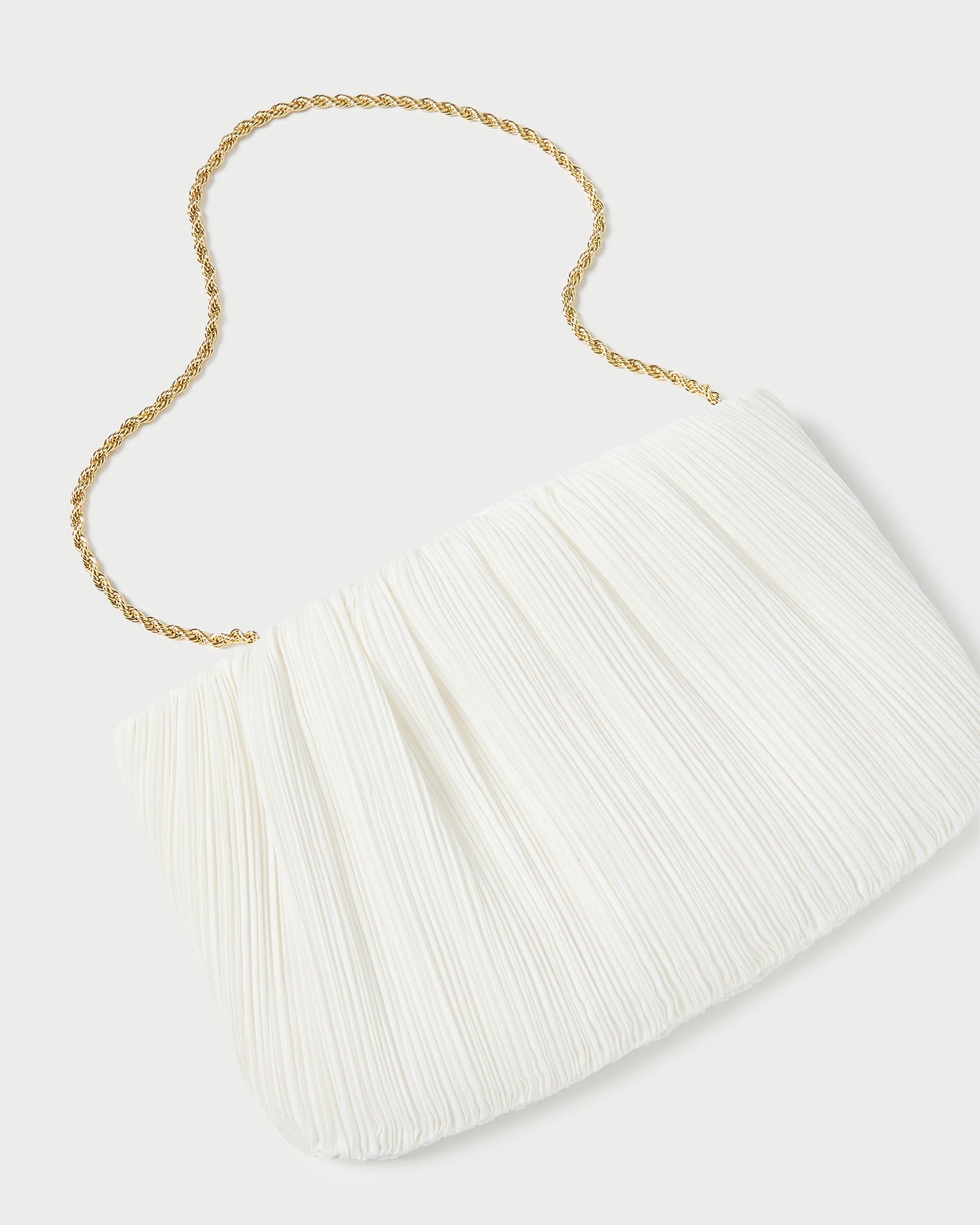Flat pleated pouch in bright white shantung. Features a removable twisted gold metal chain strap, frame closure, full lining, and interior card slot.