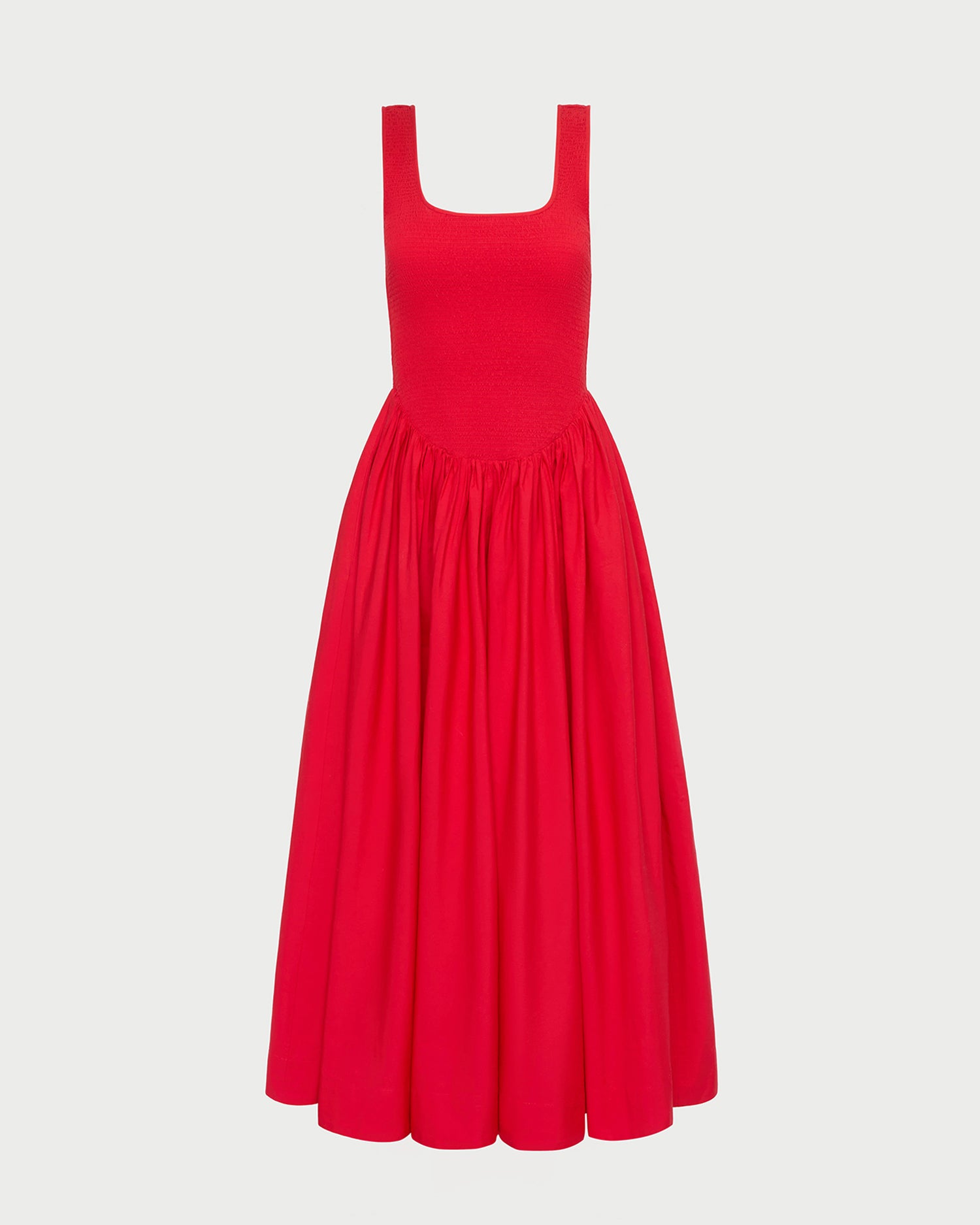 Sleeveless midi dress in red cotton. Features a square neckline, a smocked bodice, and a flared skirt.