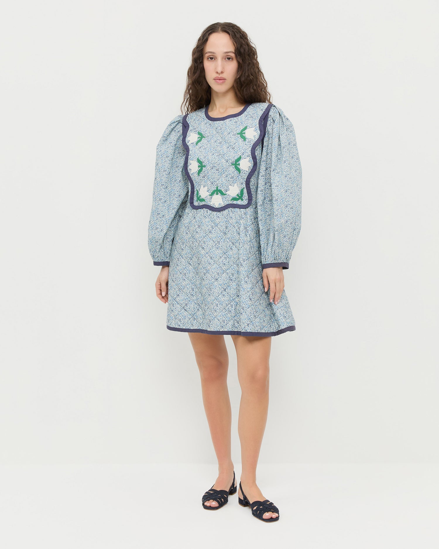Mini dress in blue floral cotton. Features a quilted texture, back ties, and elastic along the back of the waist for a secure fit, a wavy yoke detail with delicate contrast trim, and delicate appliqué floral details.