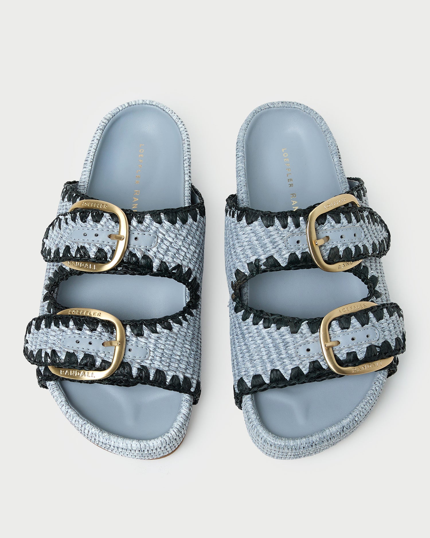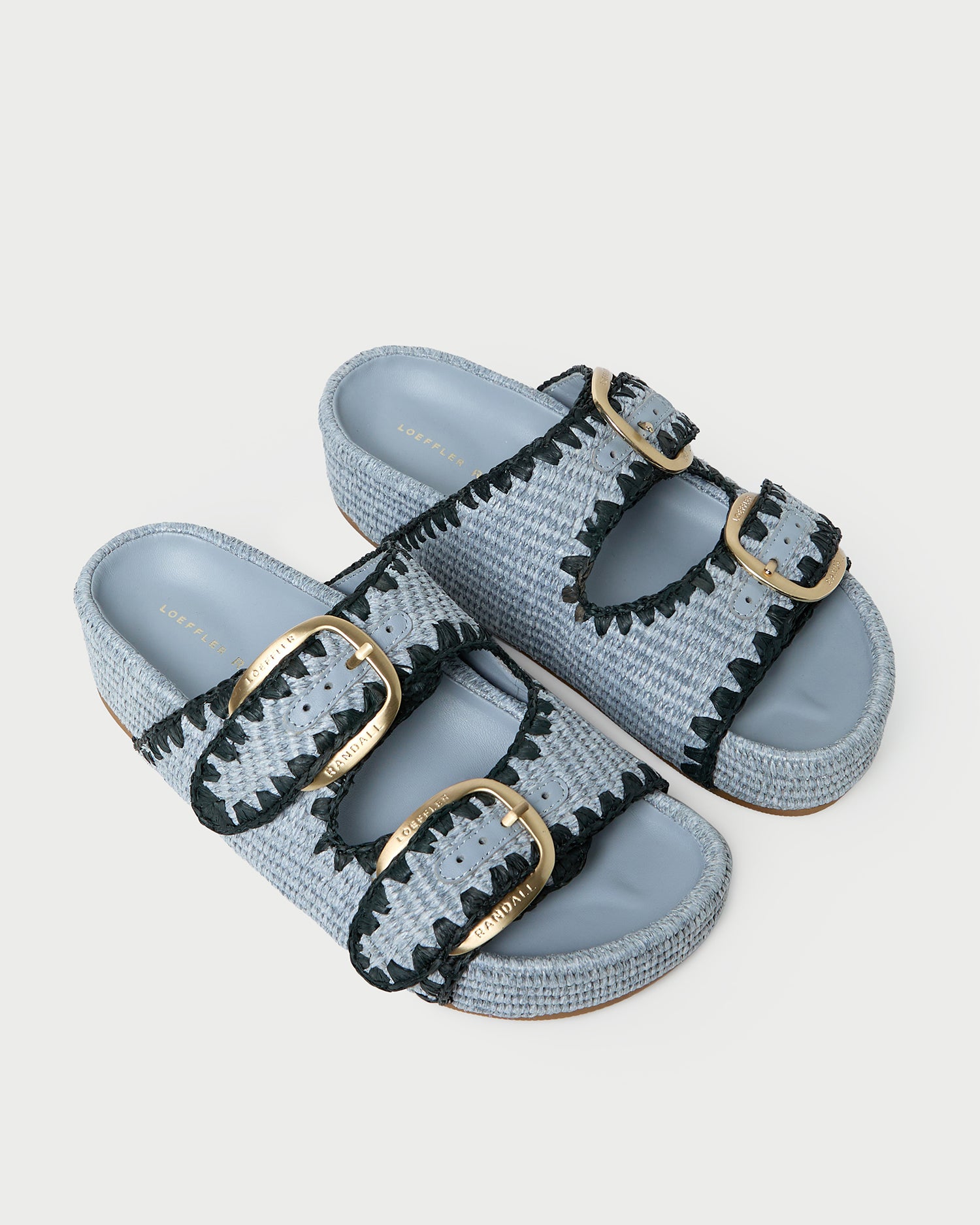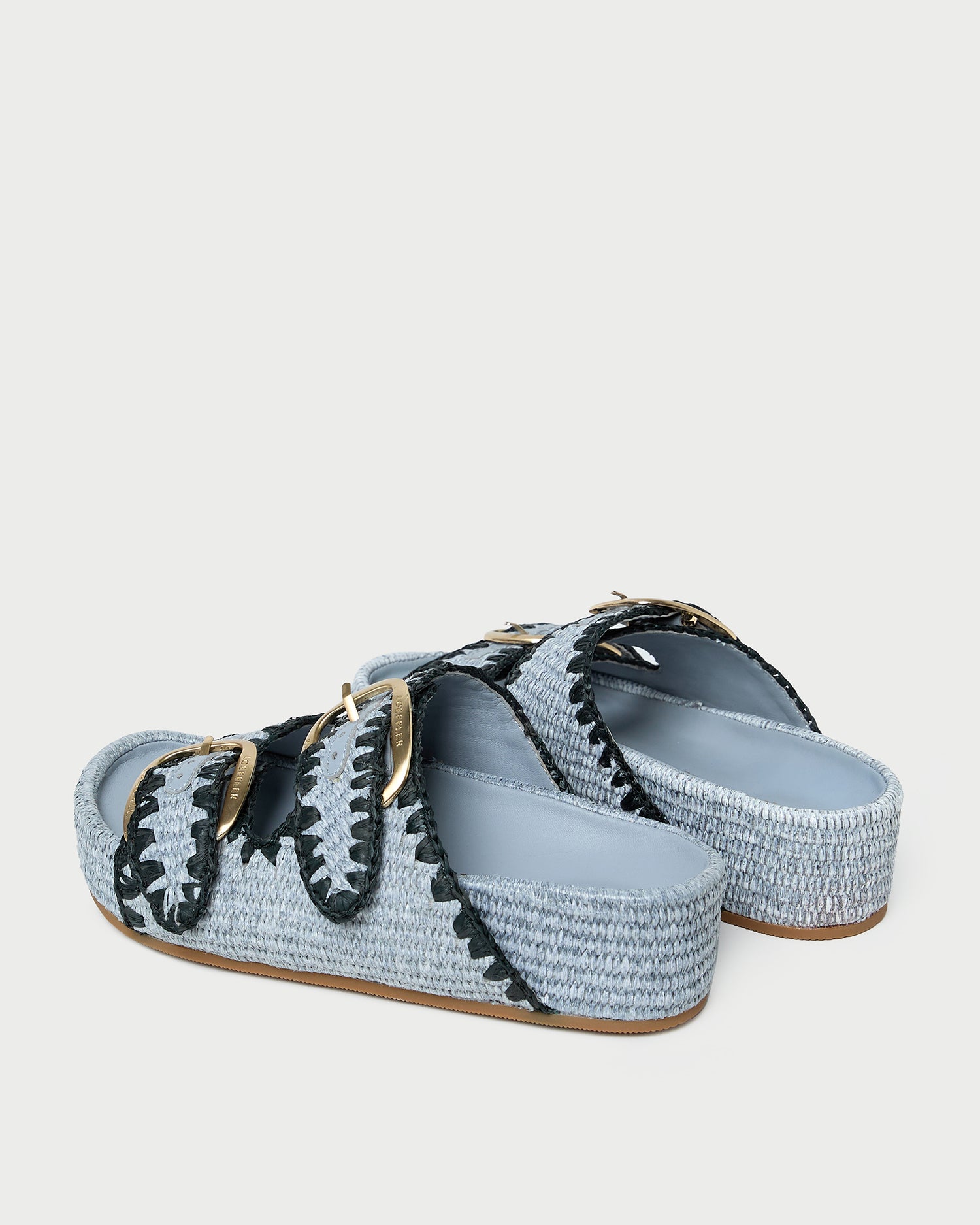 Two-band platform sandal in light blue chunky woven fabric. Features our signature buckle hardware, a padded leather footbed, an open toe, and velcro fastenings at the straps. 1.75-inch platform.
