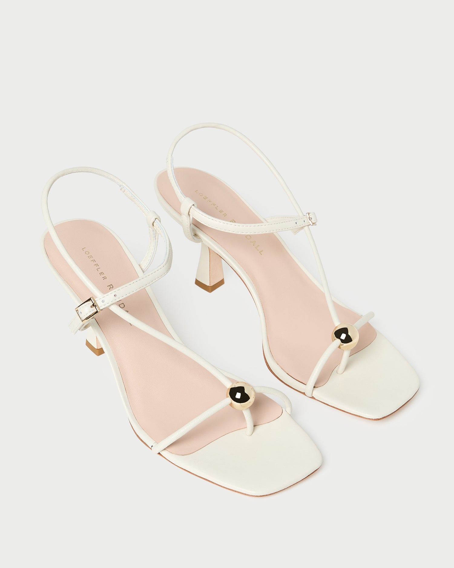 Mid-heel sandal in white nappa leather. Features a champagne ball detail, an open toe, a padded footbed with a gold-stamped logo, and a delicate strappy design with buckle closure. 2.75-inch heel.