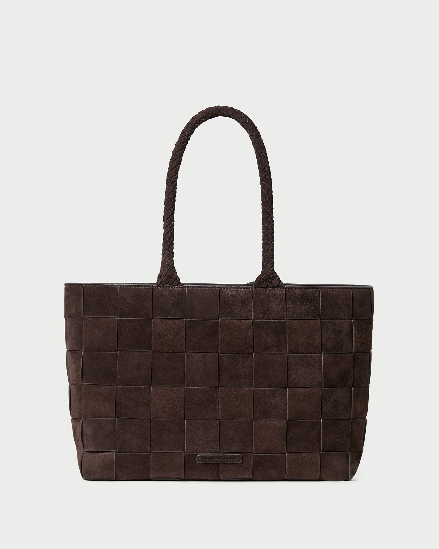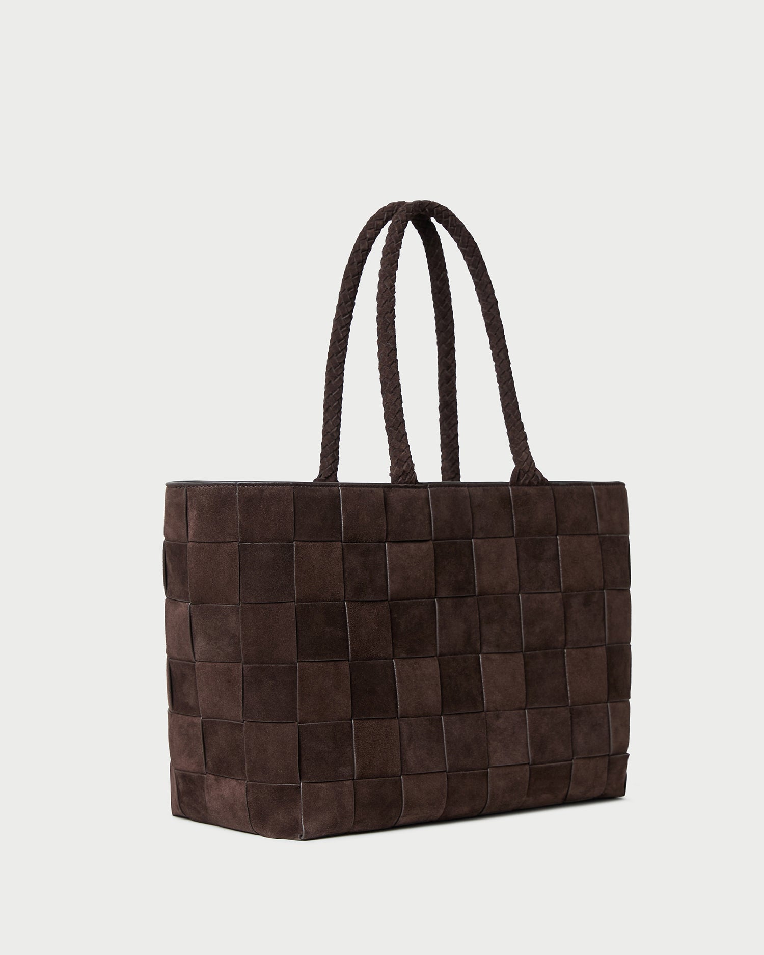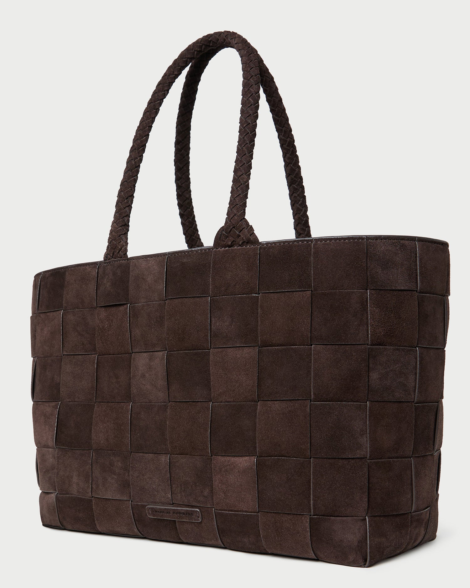 Klara Brown Woven Suede Tote in brown woven suede and Diane Dress in brown and cream gingham cotton.