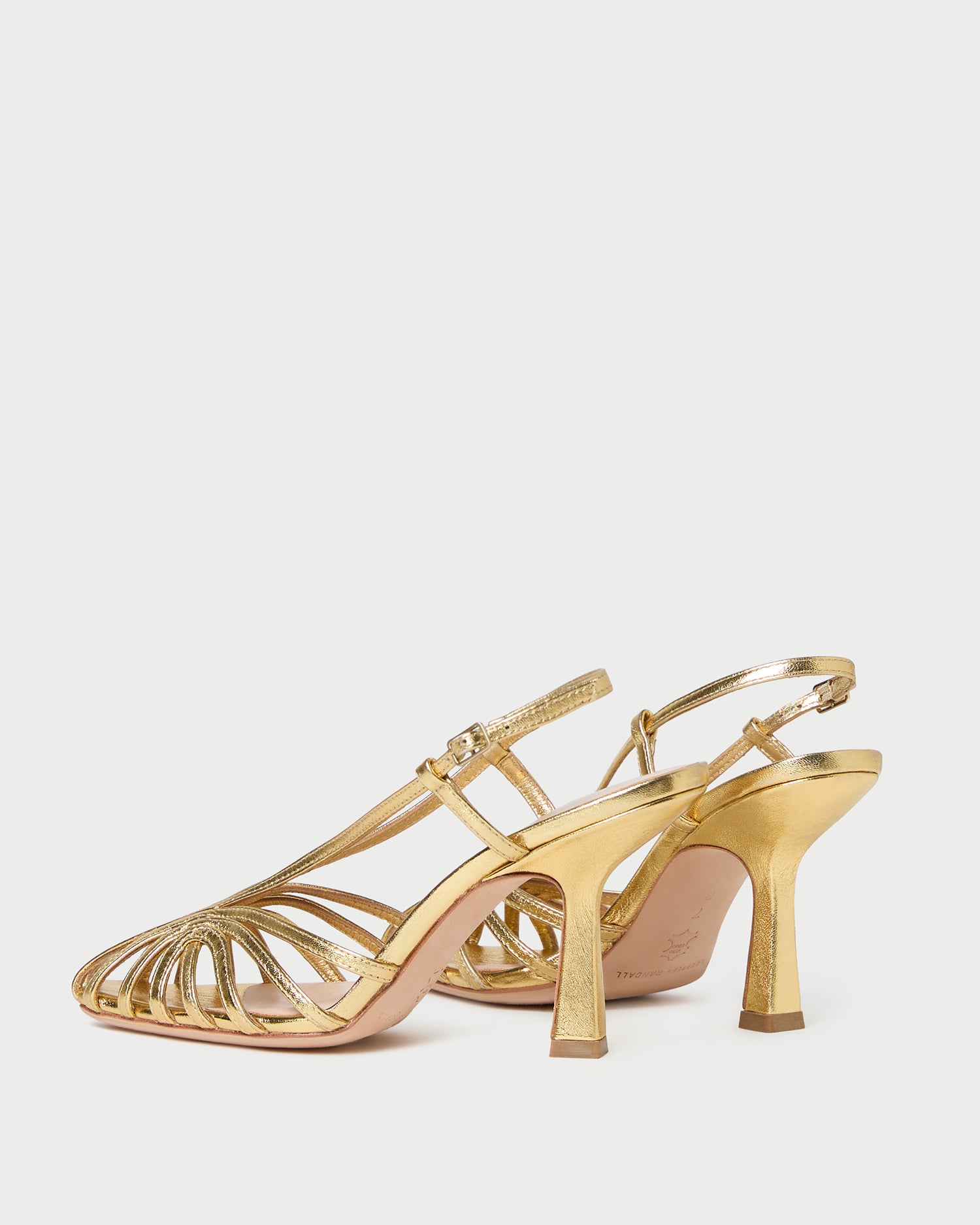 Alexandra Gold Slingback Heel in gold leather and Thelma Eyelet Dress in mint cotton.