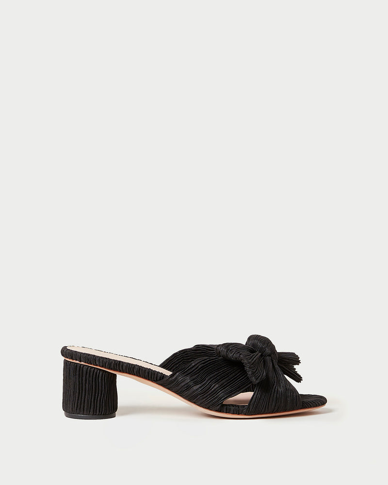 Pleated mid-heel sandal in black organza fabric topped with our signature knotted bow. Features a padded footbed with gold stamped logo. Open toe, slips on. 2 inch heel.