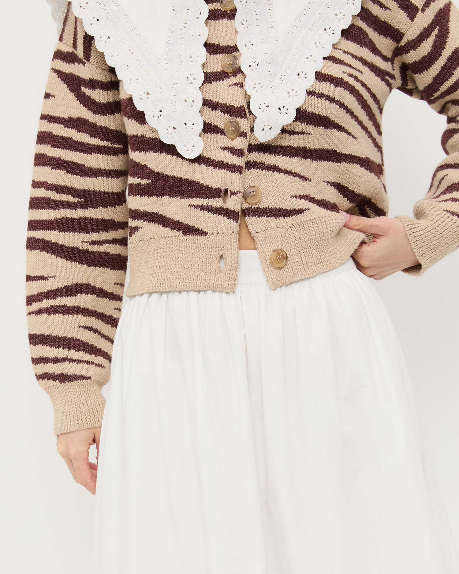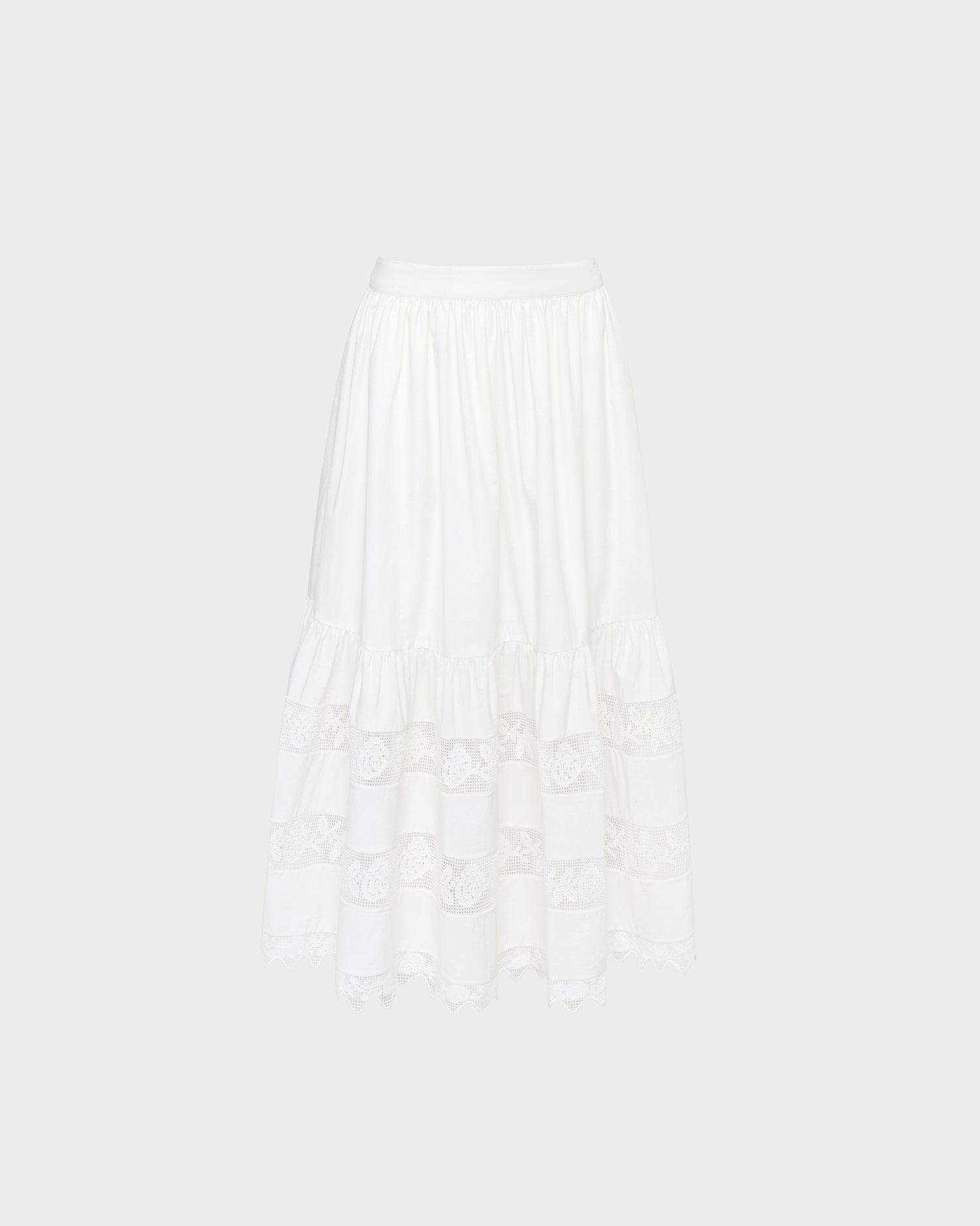 Midi skirt in cream cotton with lace detailing. Features an elastic waistband and side zip closure.