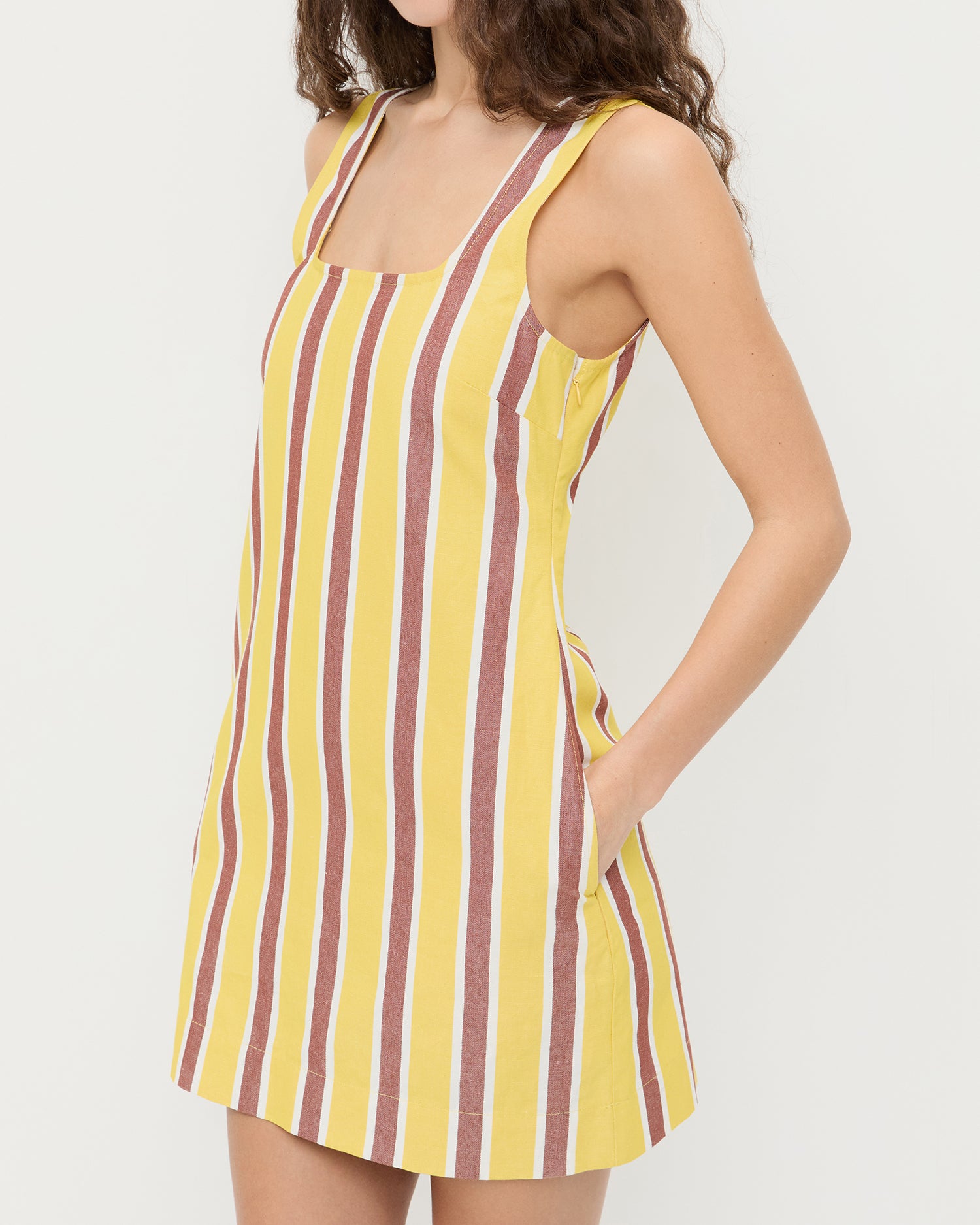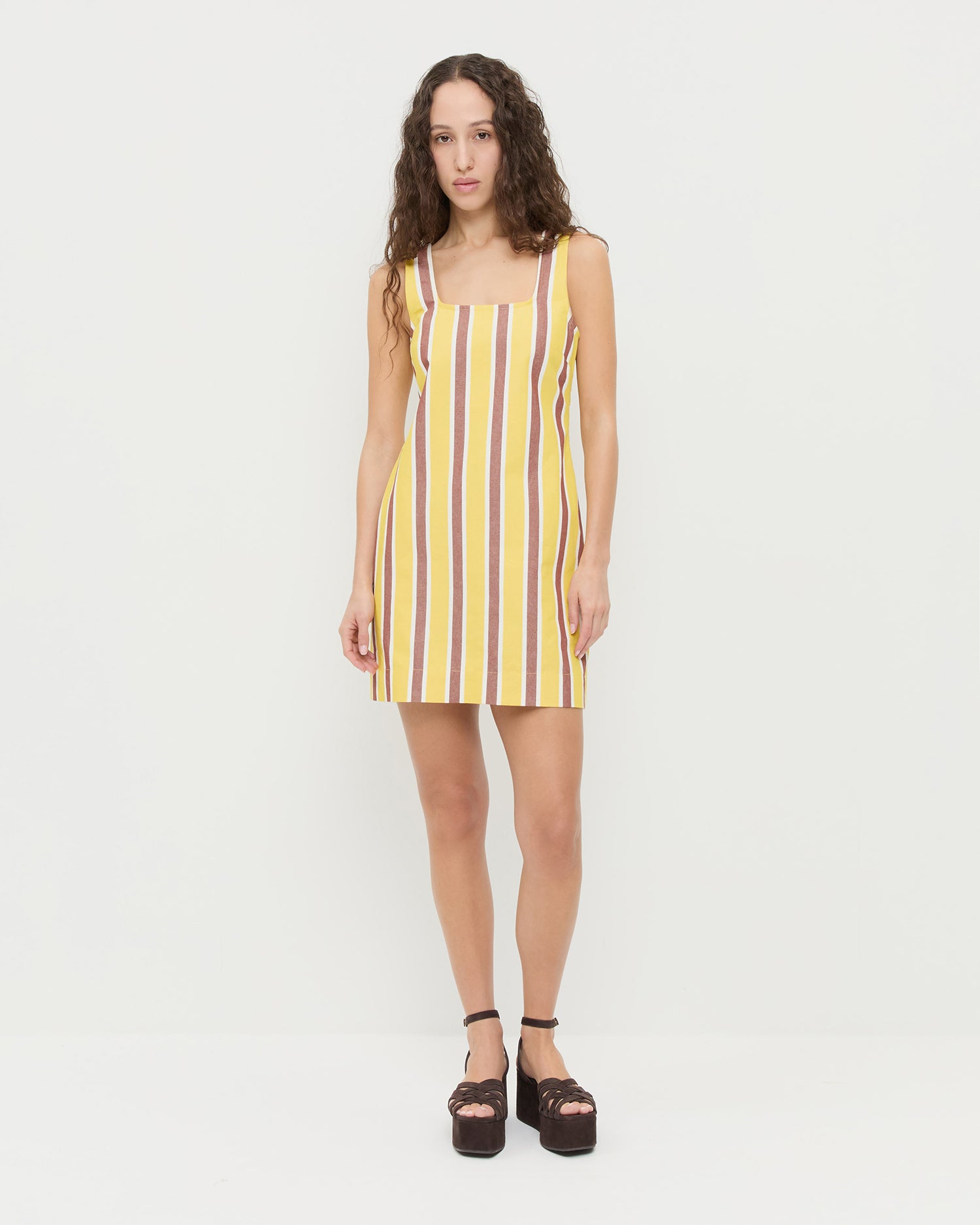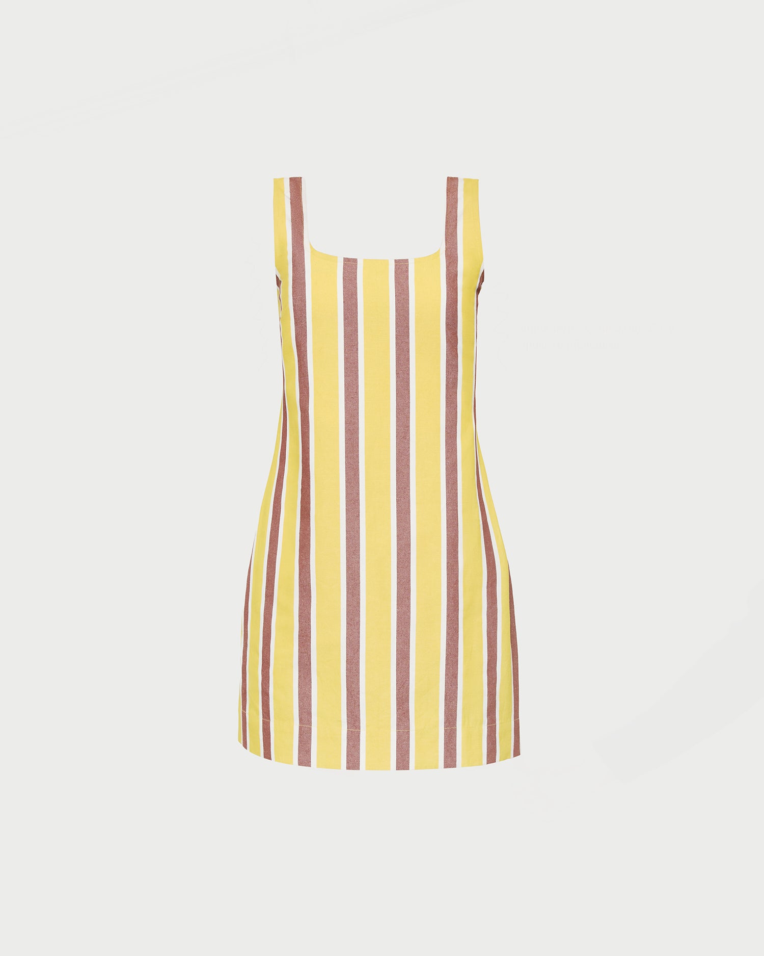 Sleeveless mini dress in yellow, white, and brown striped cotton-linen fabric. Features a square neckline, side seam zip, and side pockets.