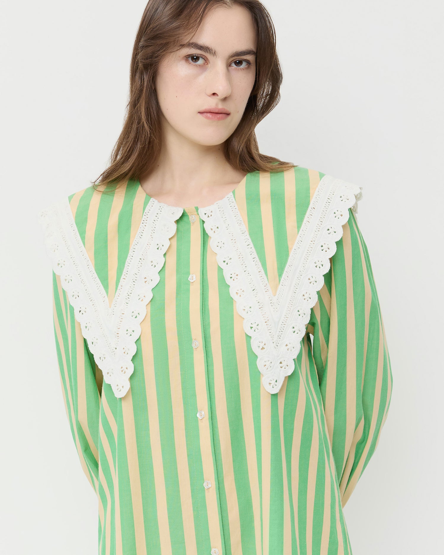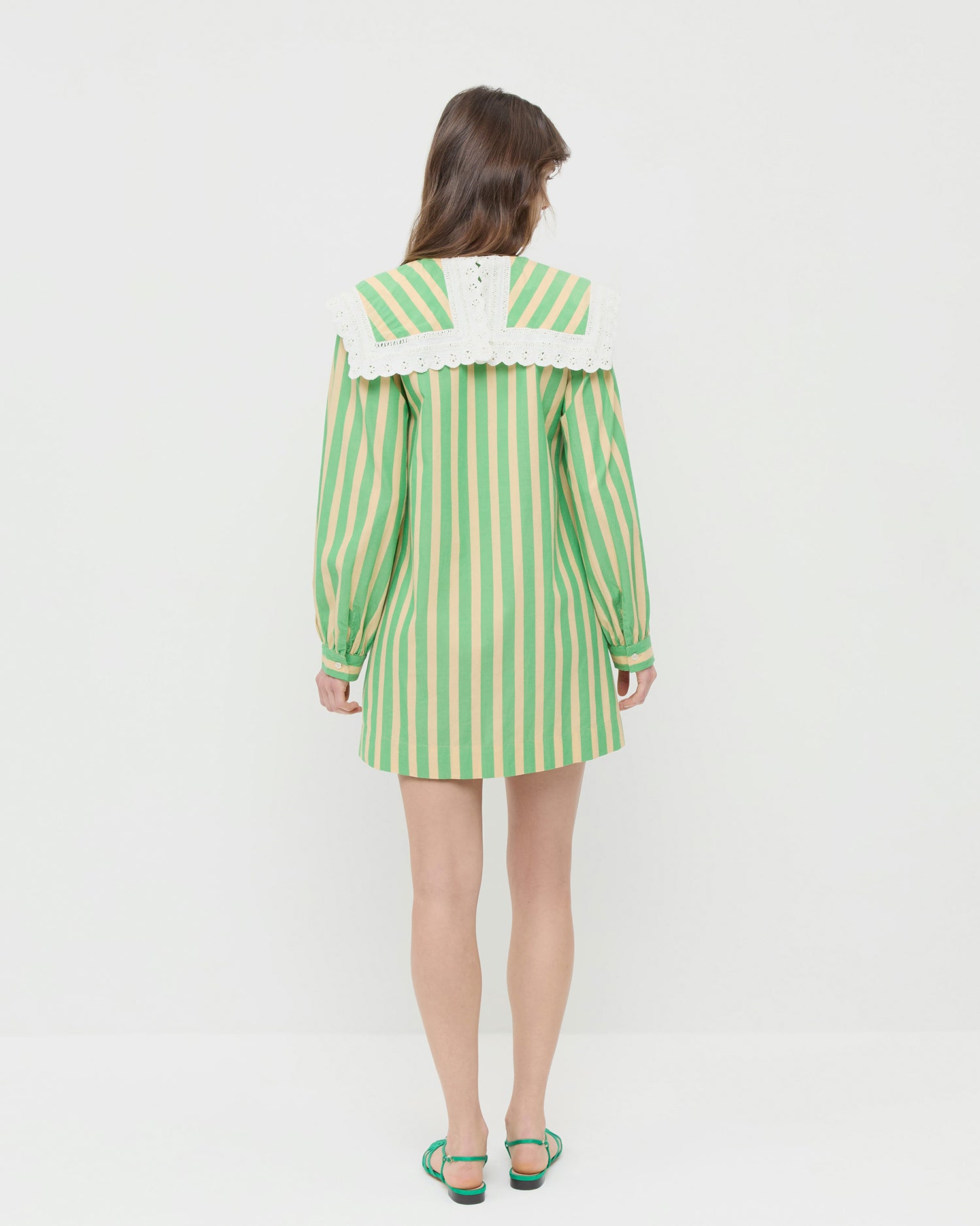 Mini button-down dress in green and tan striped cotton. A design inspired by our best selling Ken Shirt, Kieran features custom embroidery on the collar, full-length sleeves, a boxy fit, and delicate flower buttons.