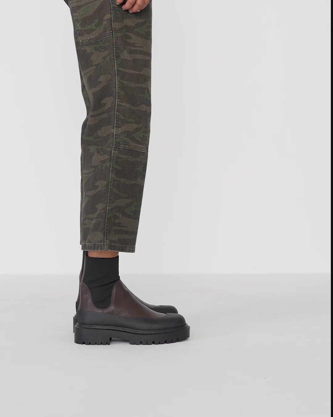 Lug sole weather boot in brown pebble leather. Features a rubber outsole, almond toe, and stretch gore ankle. Pulls on. 0.5-inch heel.