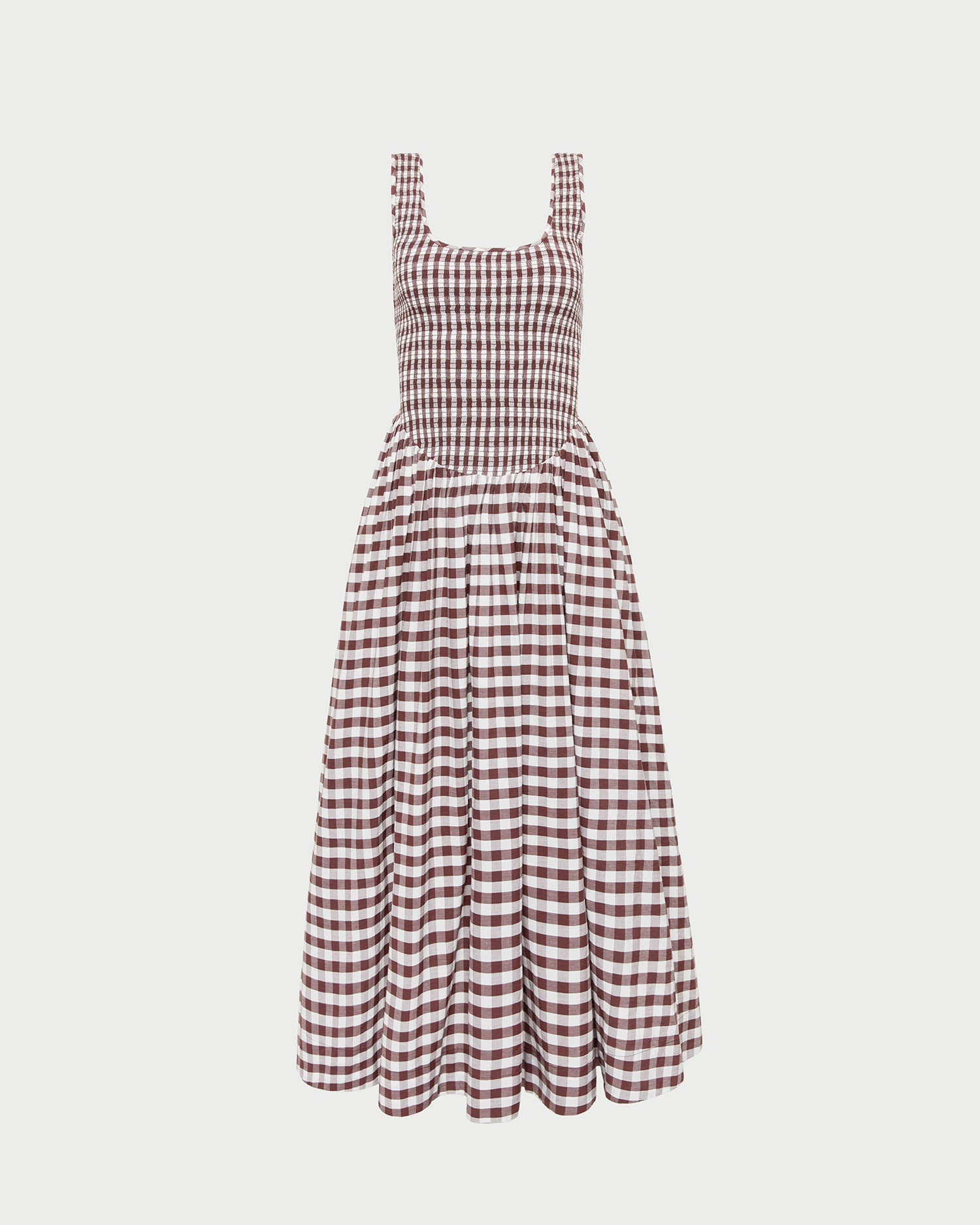 Sleeveless midi dress in brown gingham cotton. Features a square neckline, a smocked bodice, and a flared skirt.