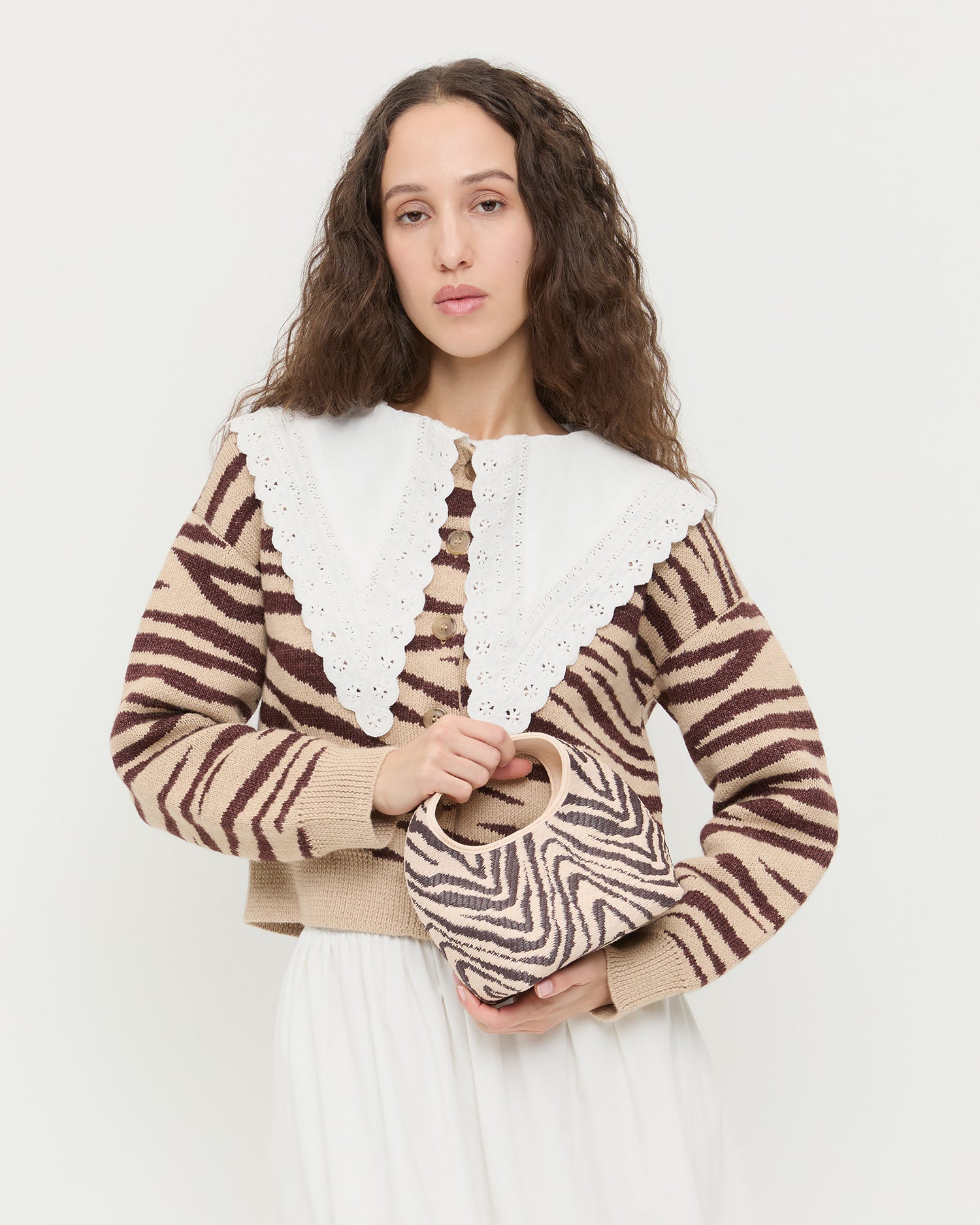 Kenzie Zebra Mini Bag in woven cotton, Bodhi Cardigan in zebra wool, Ken Shirt in white cotton, and Delaney Skirt in white cotton.