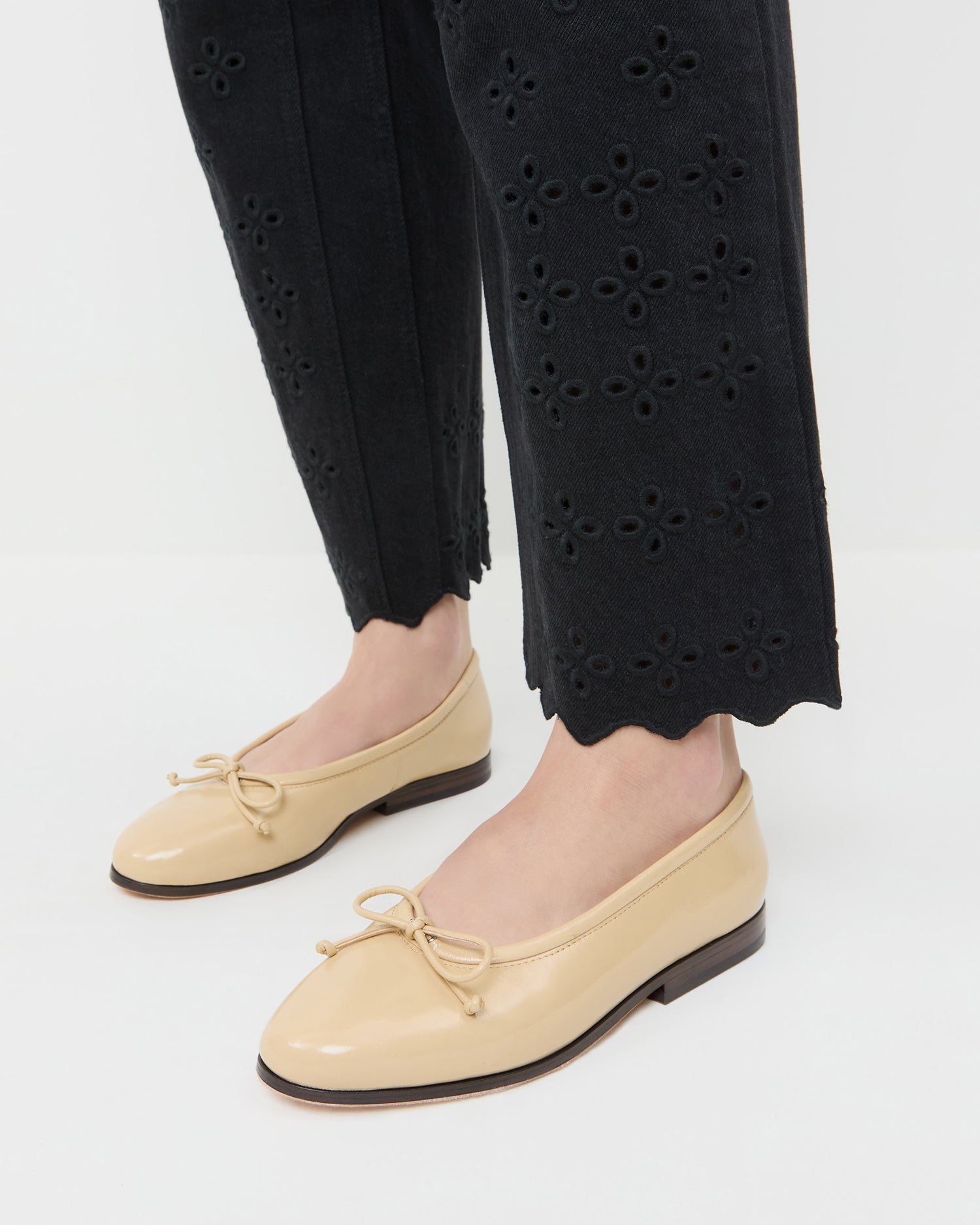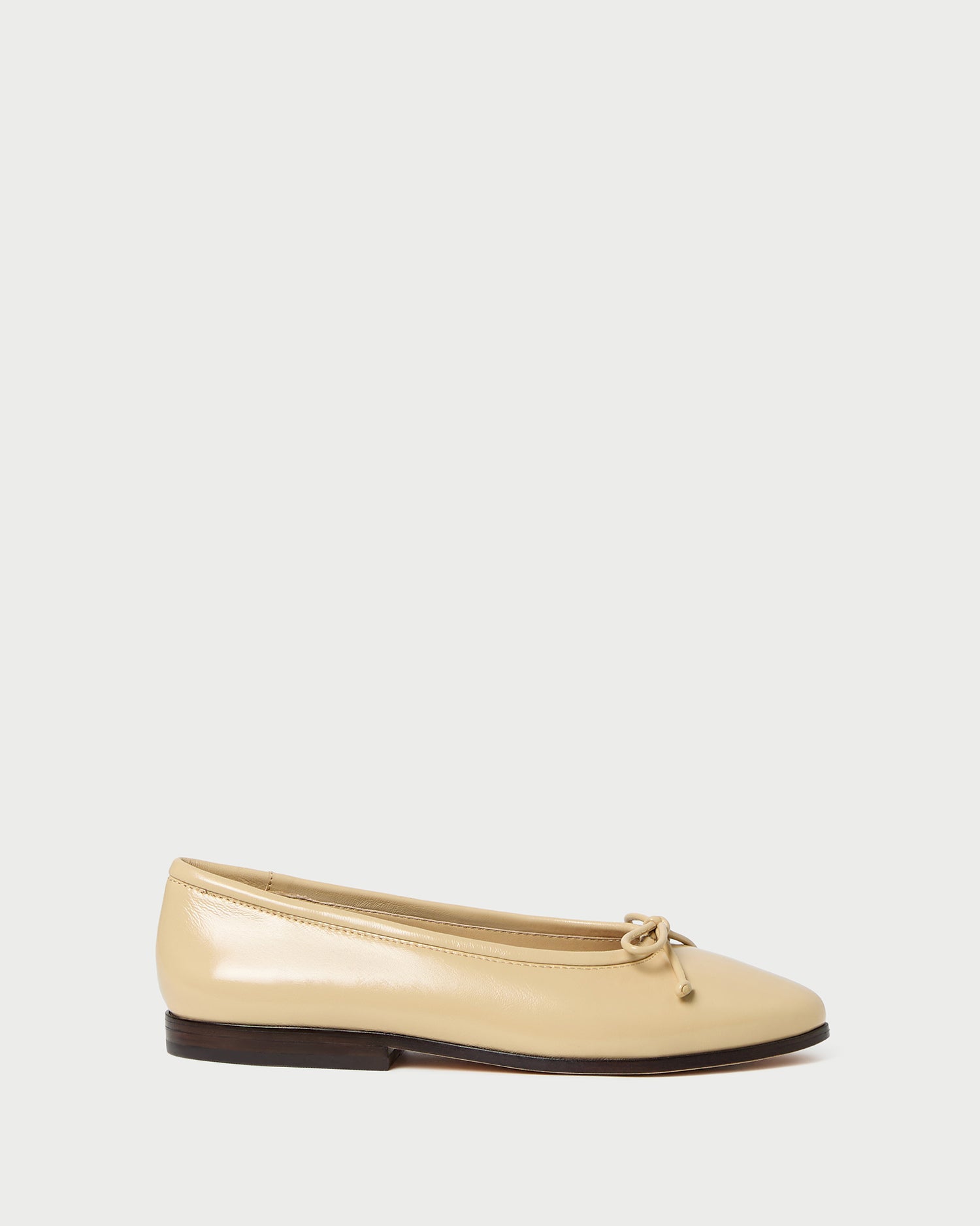 Ballet flat in bisque patent nappa leather with bow detail. Features an almond toe and a padded leather footbed with gold stamped logo. Slips on.