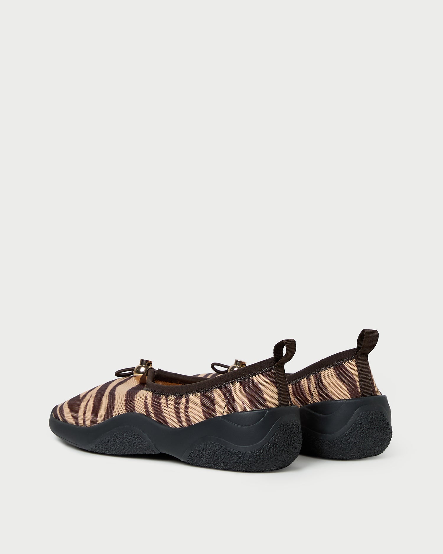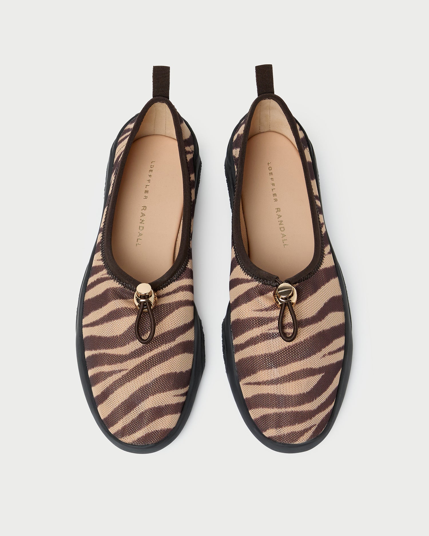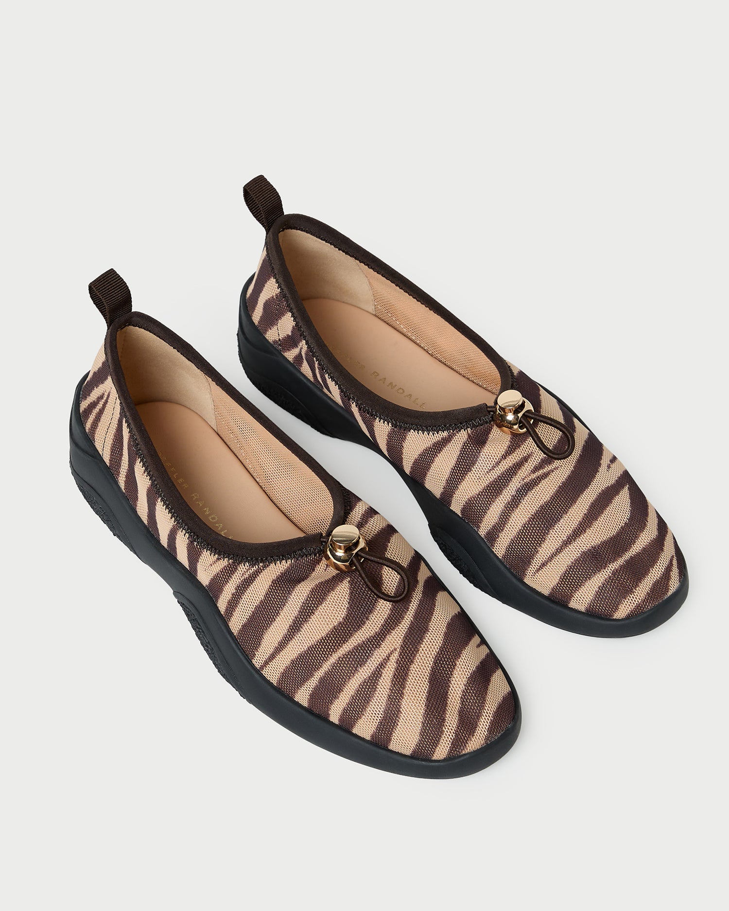 Raina Zebra Mesh Flat in zebra print mesh and Demi Embroidered Pant in tan cotton.