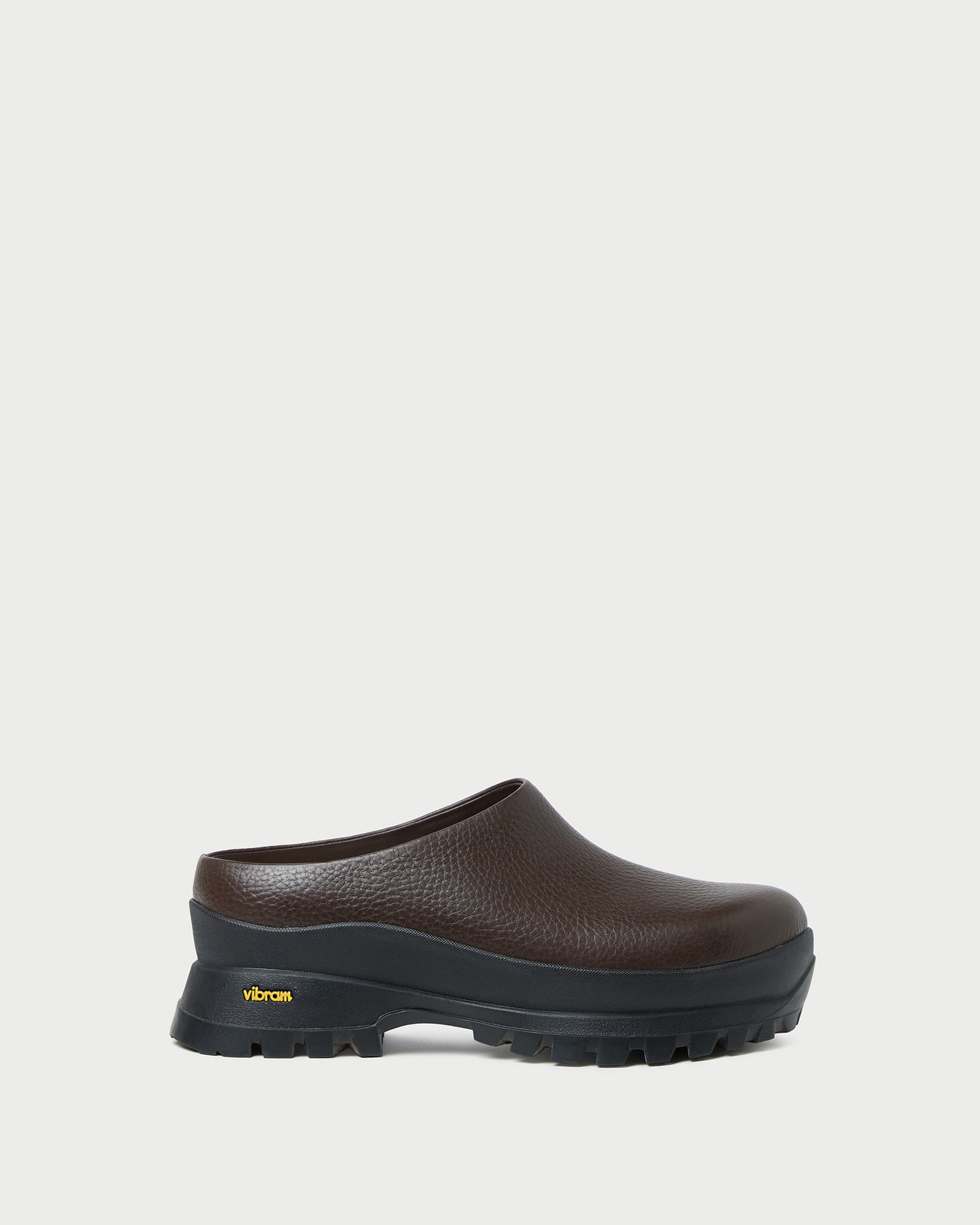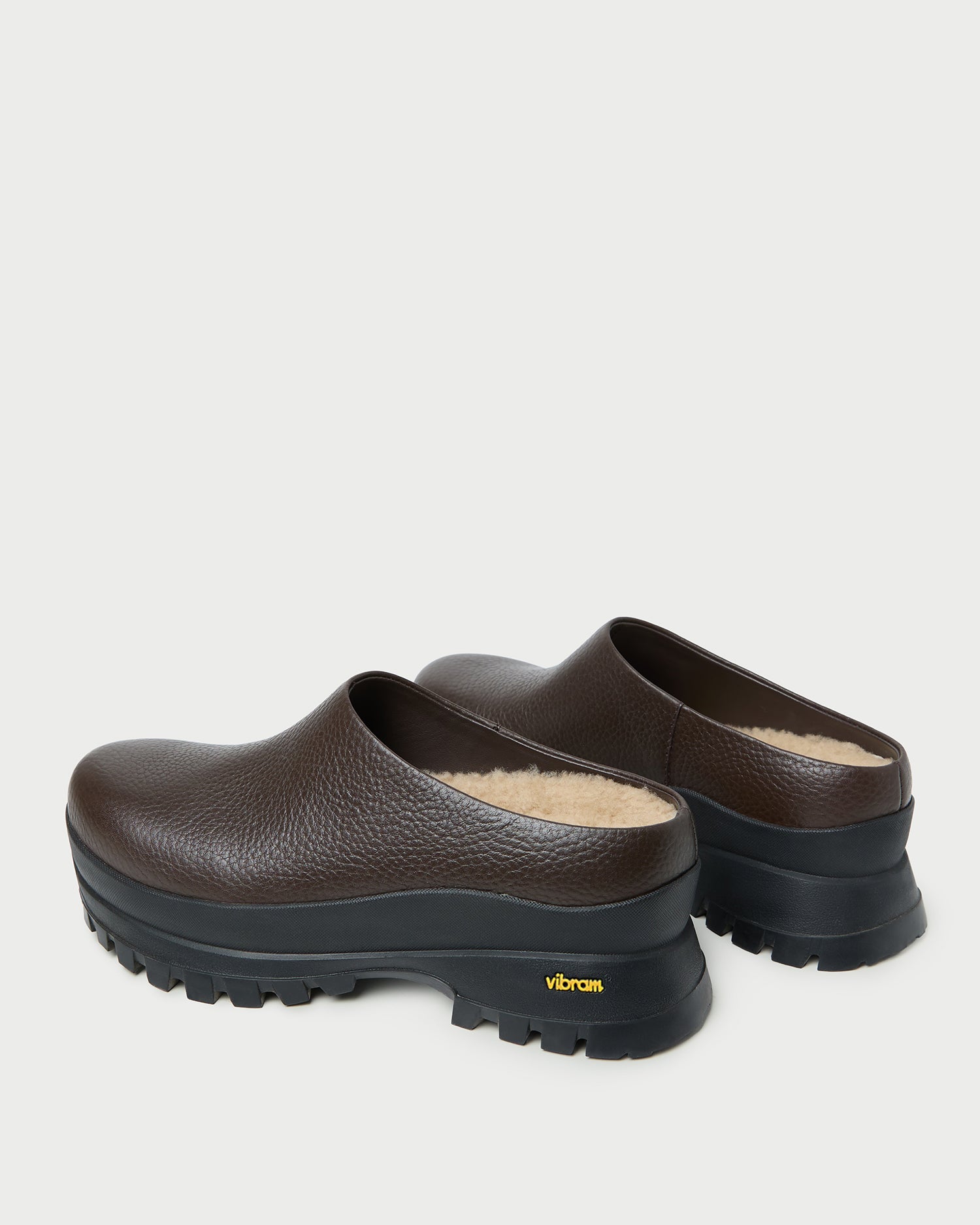 Lug-sole mule in brown pebbled leather. Features a rounded toe, a plush shearling insole, and a Vibram outsole. 2-inch platform.