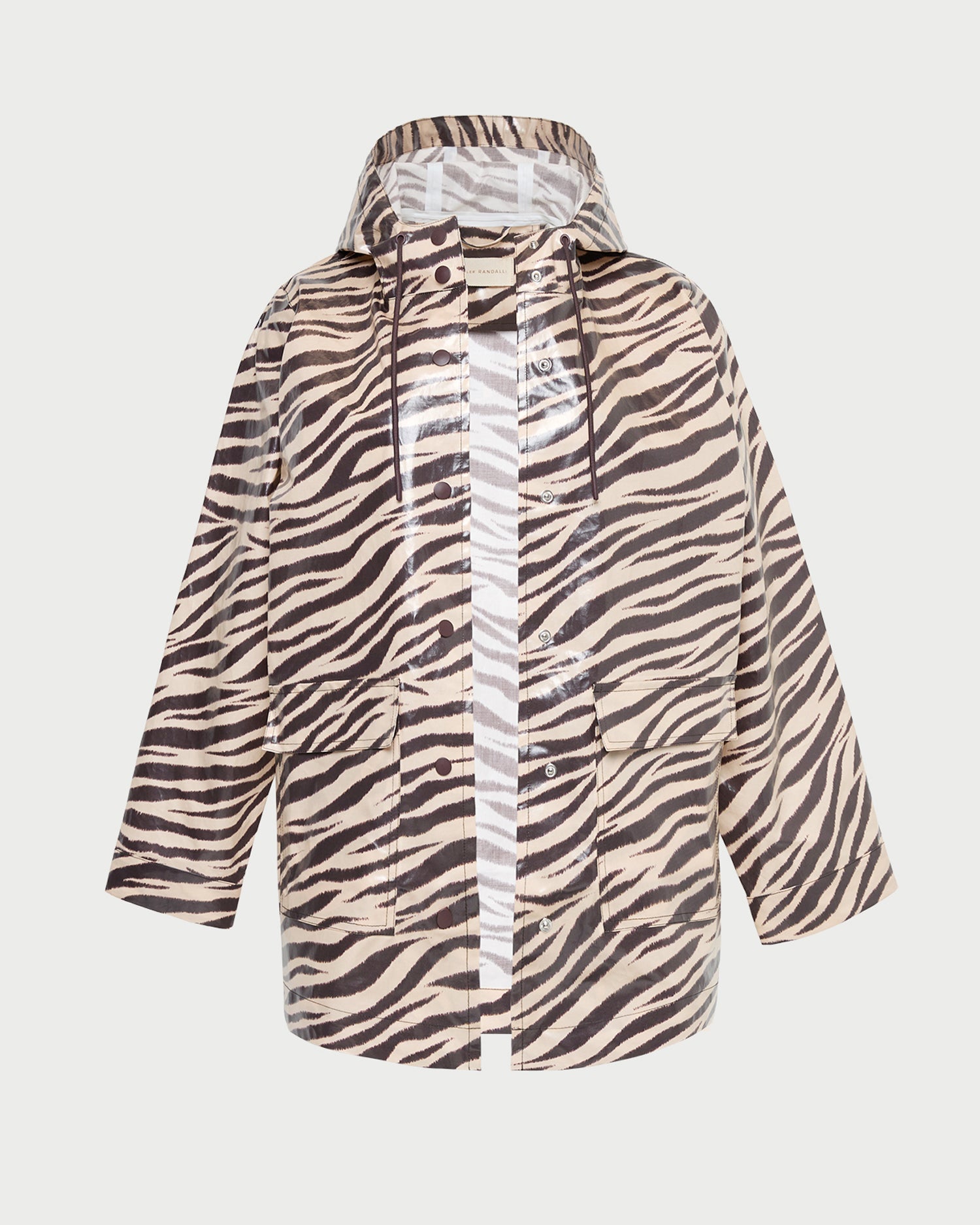 Rain jacket in zebra-printed coated cotton. Features two pockets, button snap closures, a hood, and a water-resistant finish. A drawstring around the neckline provides a more tailored, protective fit.
