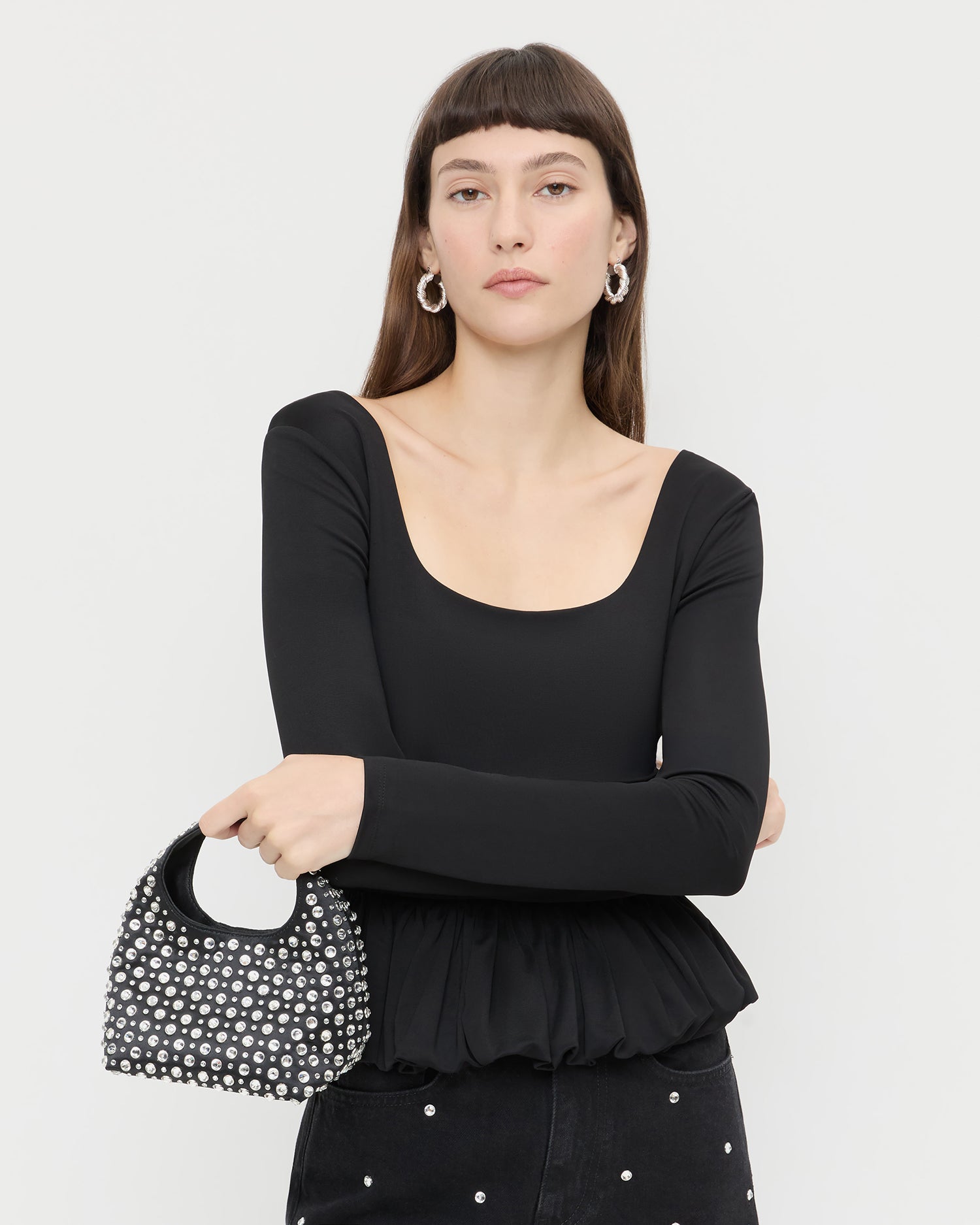 Kenzie Black/Crystal Mini Bag in black satin with crystal accents, Posie Peplum Top in black jersey, and Winona Denim Pant in black denim with crystal accents.