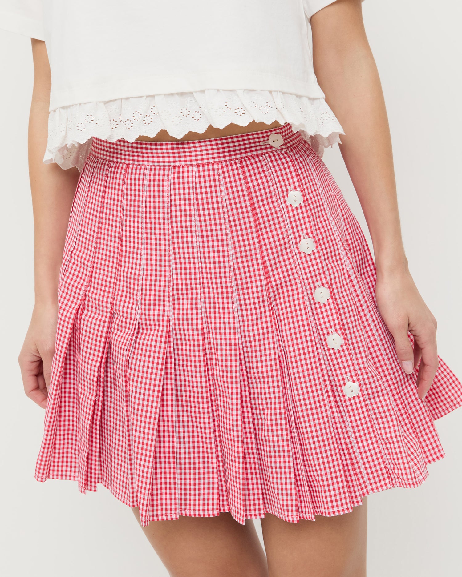 Pleated skirt in red gingham. A shorter version of our Emlyn skirt, Caroline features a tonal button closure from the left waist to mid-thigh. Unlined.