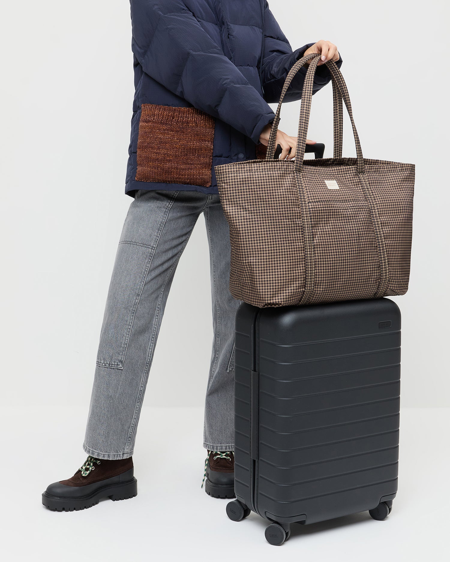 Dina Brown/Black Check Travel Tote in brown and black gingham nylon.