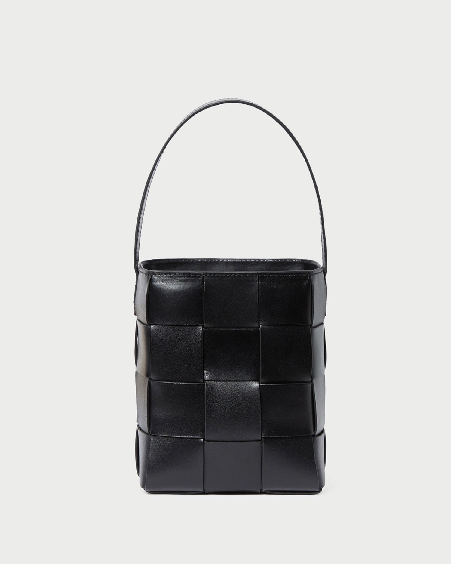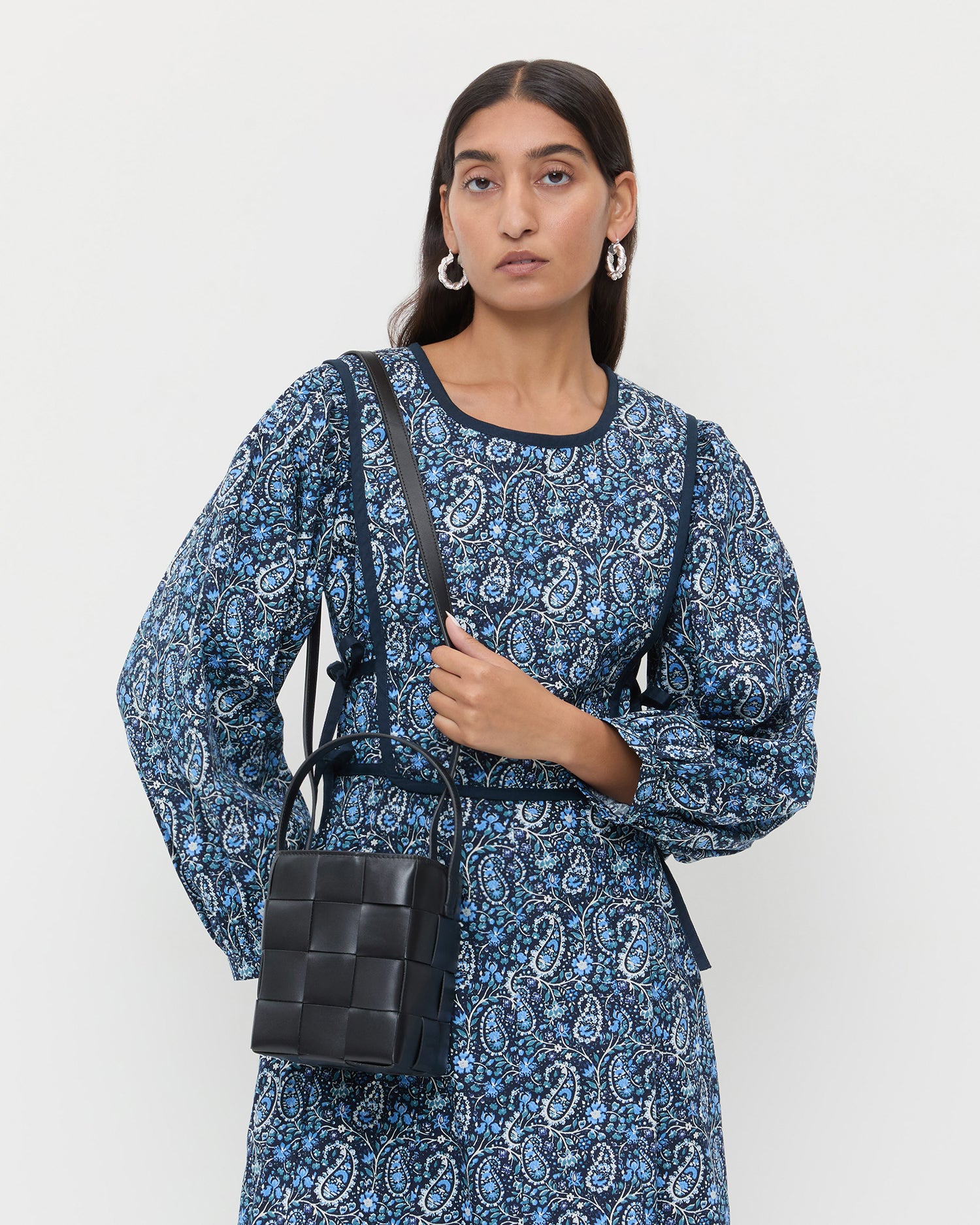 Laith Black Leather Bucket Bag in black woven leather and Ainsley Dress in blue floral.