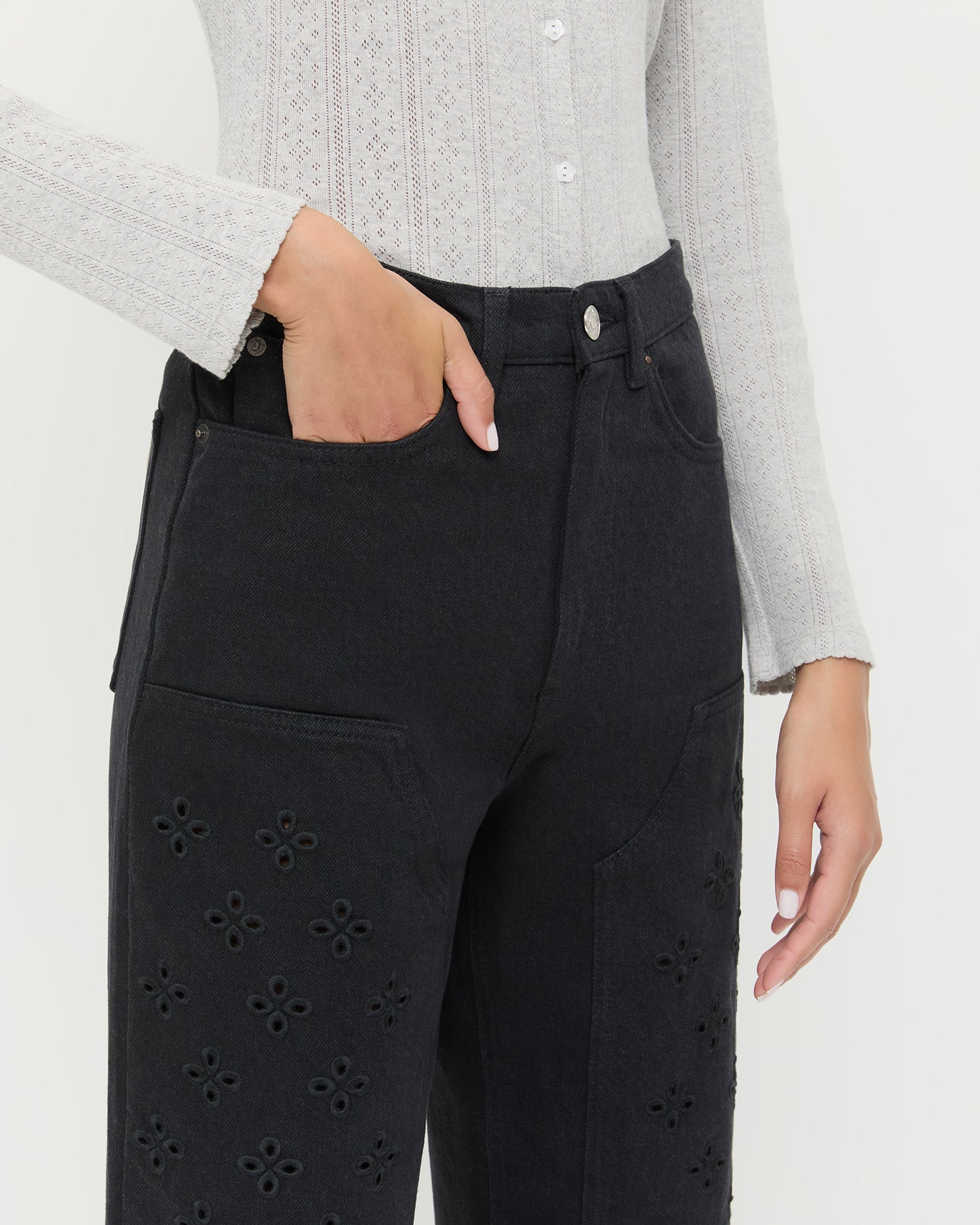 Carpenter-style pant in black washed denim with eyelet lace cutout detailing at the front panels. Features a fixed waist and a scalloped hem.