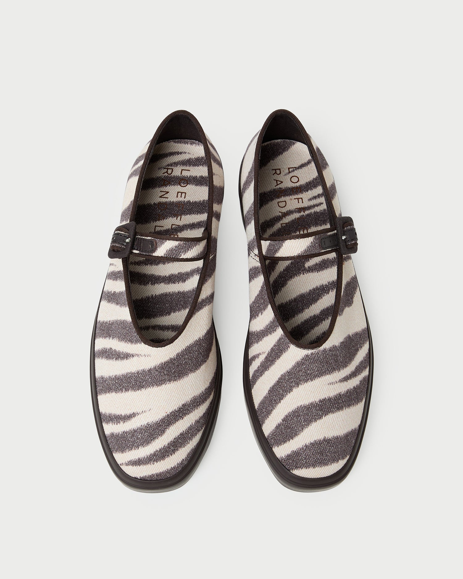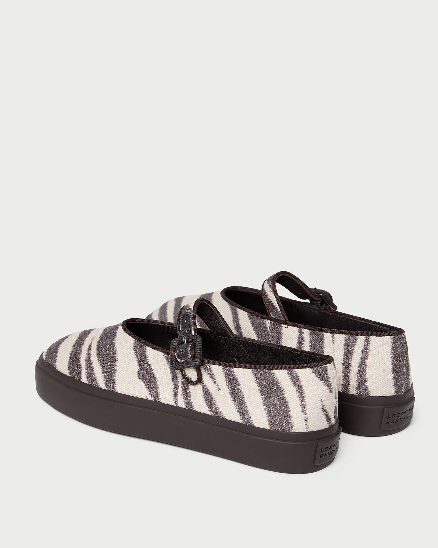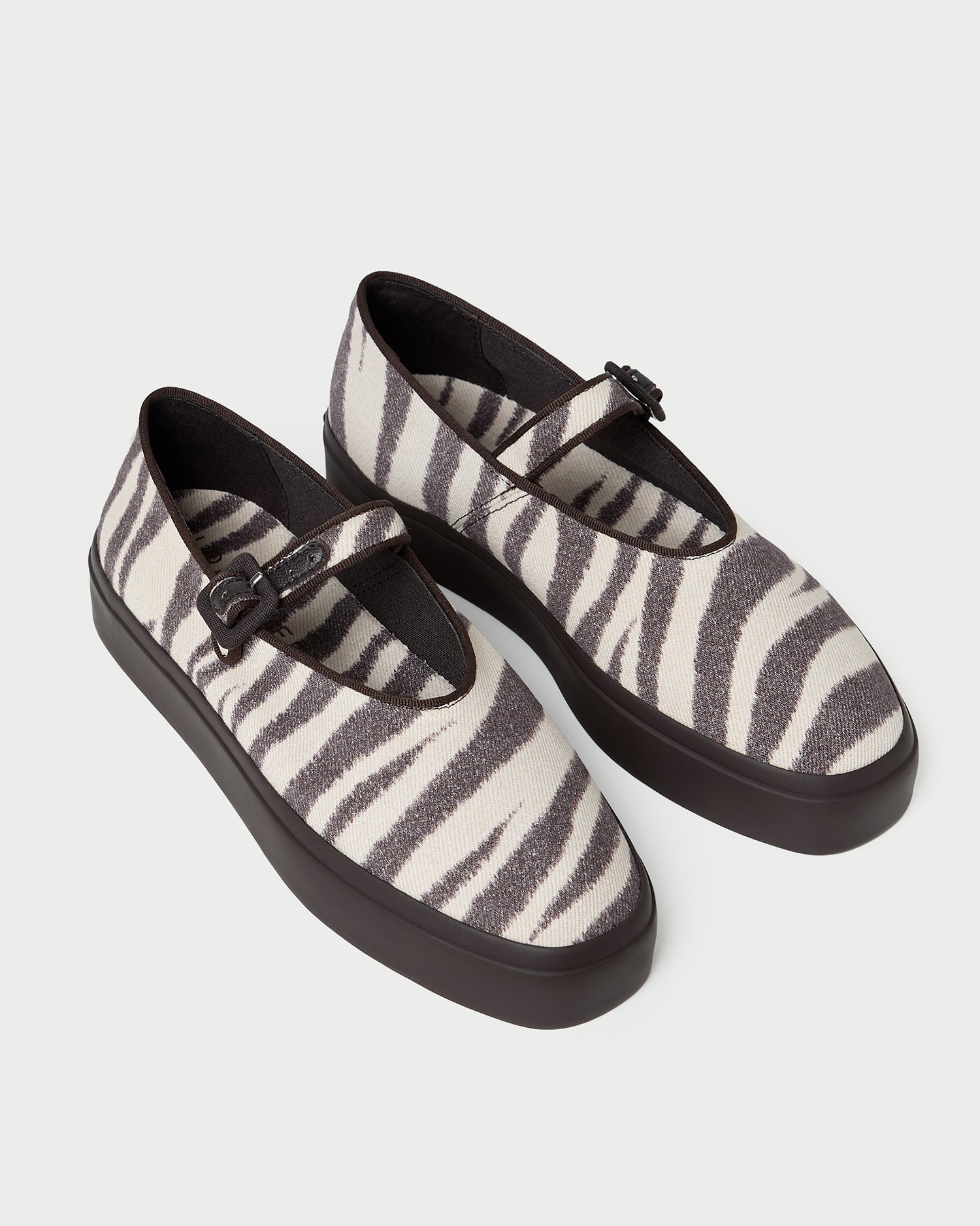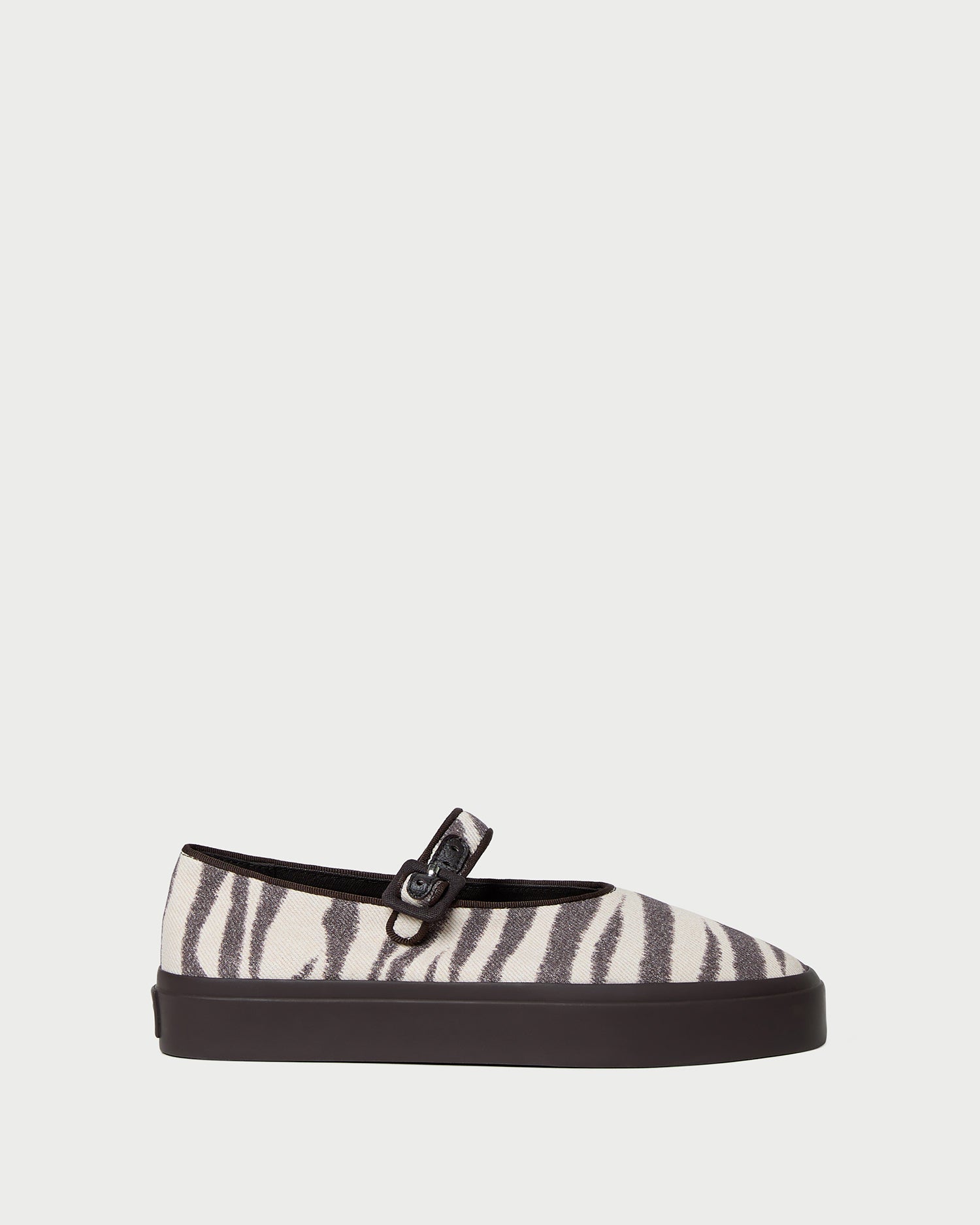 Mary Jane sneaker in zebra canvas. Features an adjustable bridge strap with a brown buckle closure, a squared toe, and a 1-inch rubber sole.
