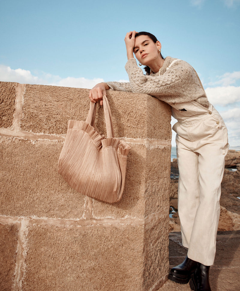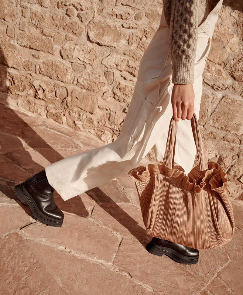 Everyday staples this season include pull-on lug soles, a roomy tote in our signature pleated fabric, and subtle statement gold dome hoops.