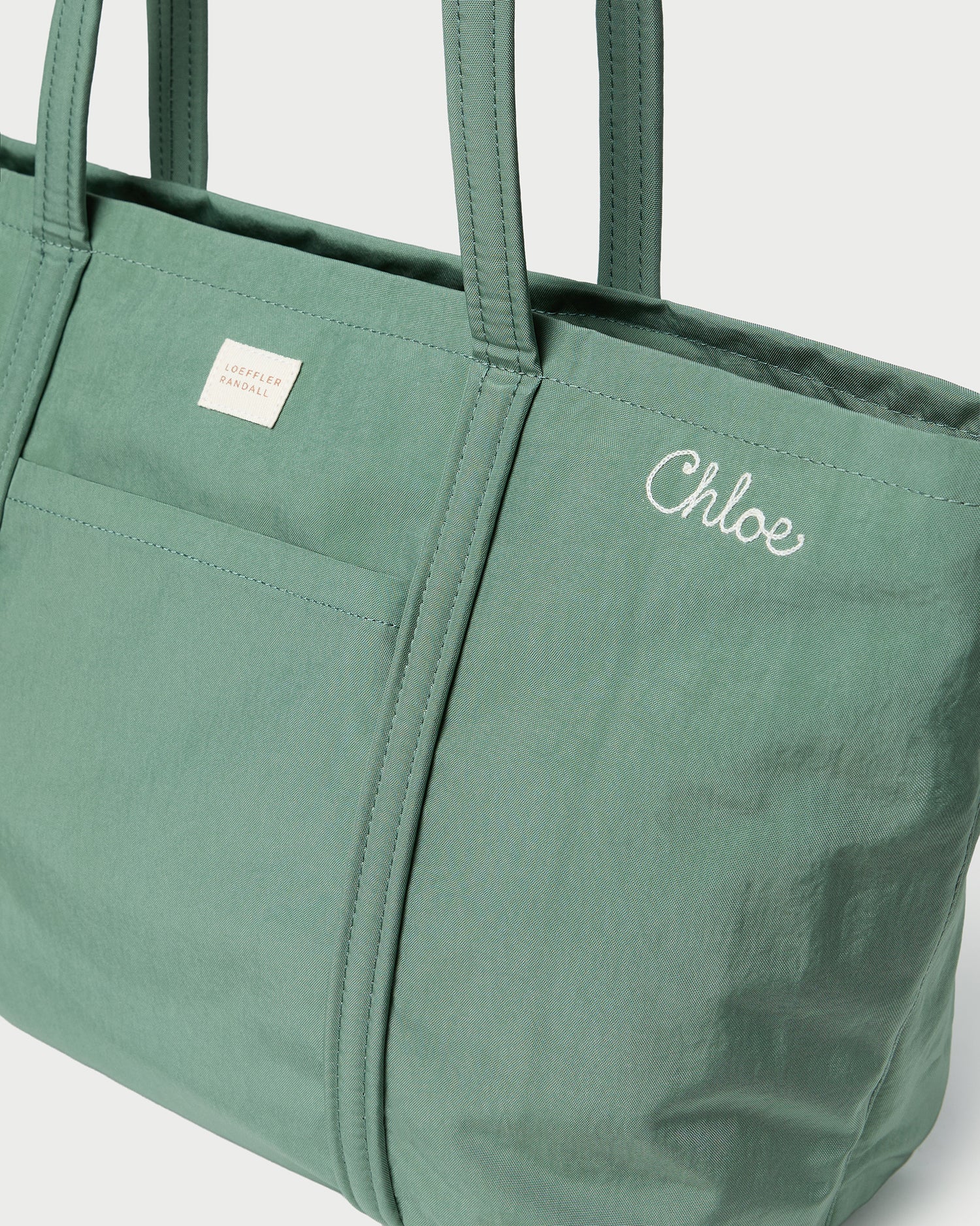 Tote bag in sage green washed nylon. Features a tonal strap, zipper closure, and exterior cotton logo. Also includes exterior pockets with zipper closure, interior pockets for easy organization, and an exterior back panel for stacking on luggage.