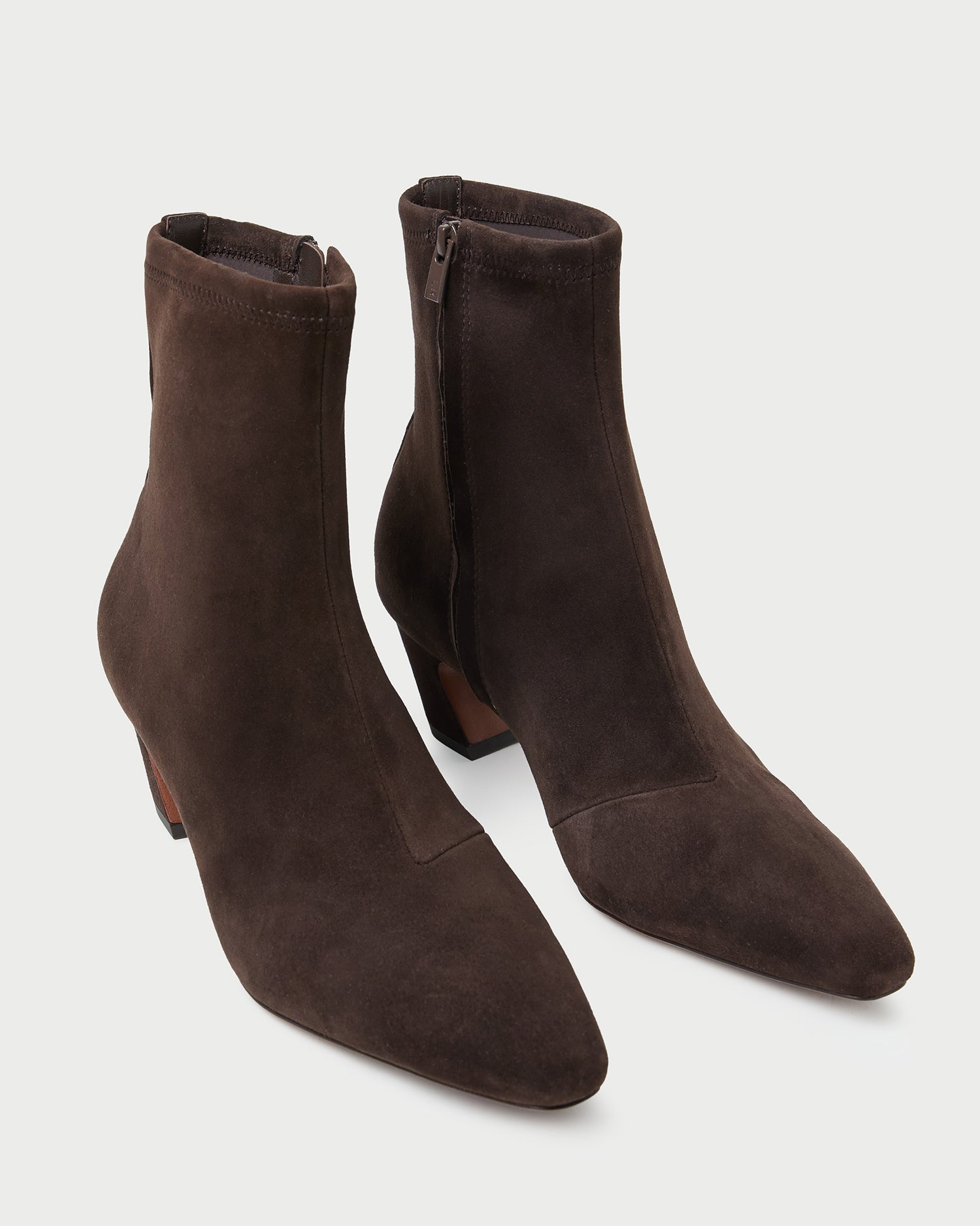 Doria Brown Suede Ankle Boot in brown suede and Demi Embroidered Pant in Natural.