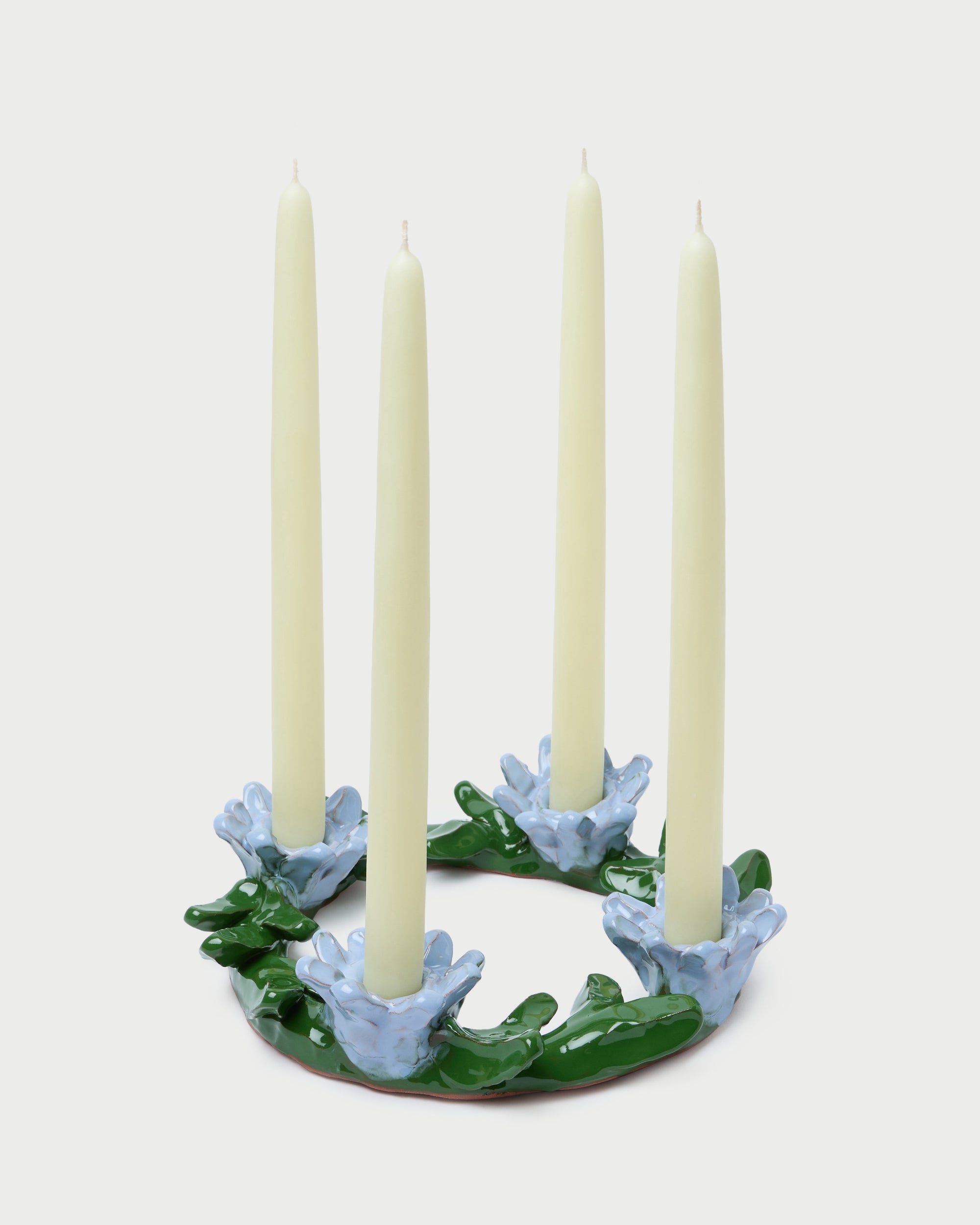 Green ceramic wreath candle holder with blue flowers, handmade by artist Sean Gerstley. Holds up to four candles.