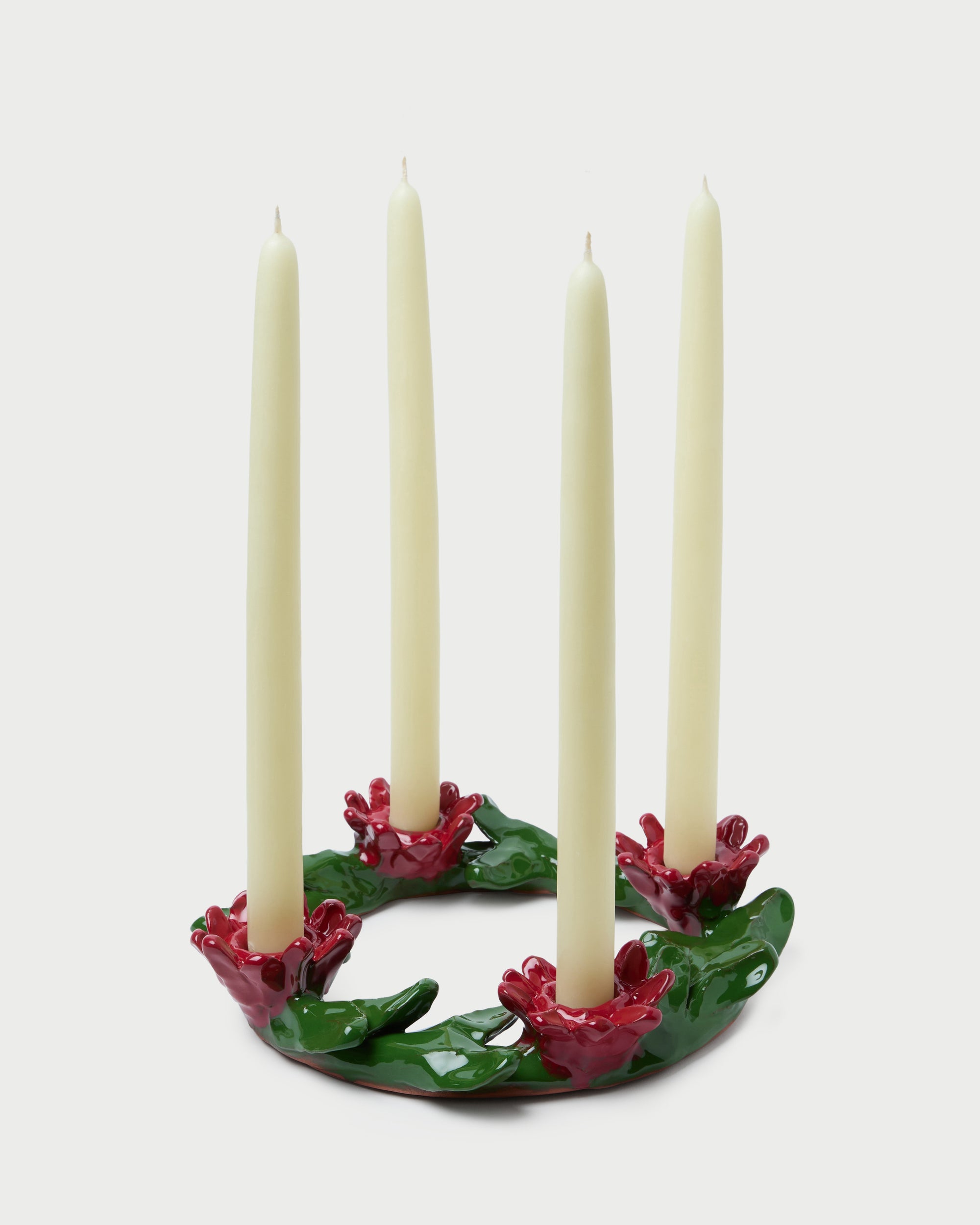 Green ceramic wreath candle holder with red flowers, handmade by artist Sean Gerstley. Holds up to four candles.