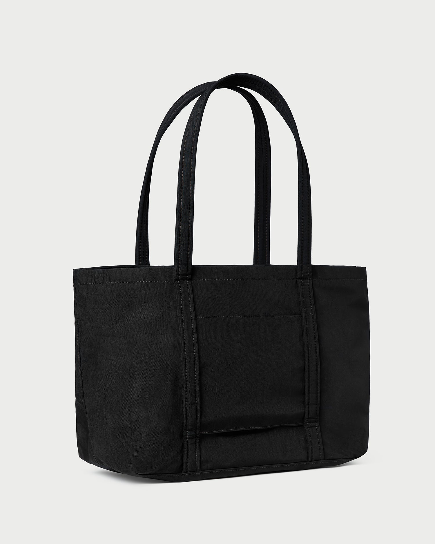 Tote bag in black water-resistant nylon. Inspired by our best-selling Dina Tote, downsized for everyday use, Mira features padded straps, a top zipper closure, interior pockets for easy organization, and an interior secured laptop sleeve. Also includes an exterior pocket with a zipper closure, an exterior back panel for sliding on suitcase handles, and an exterior cotton logo patch.