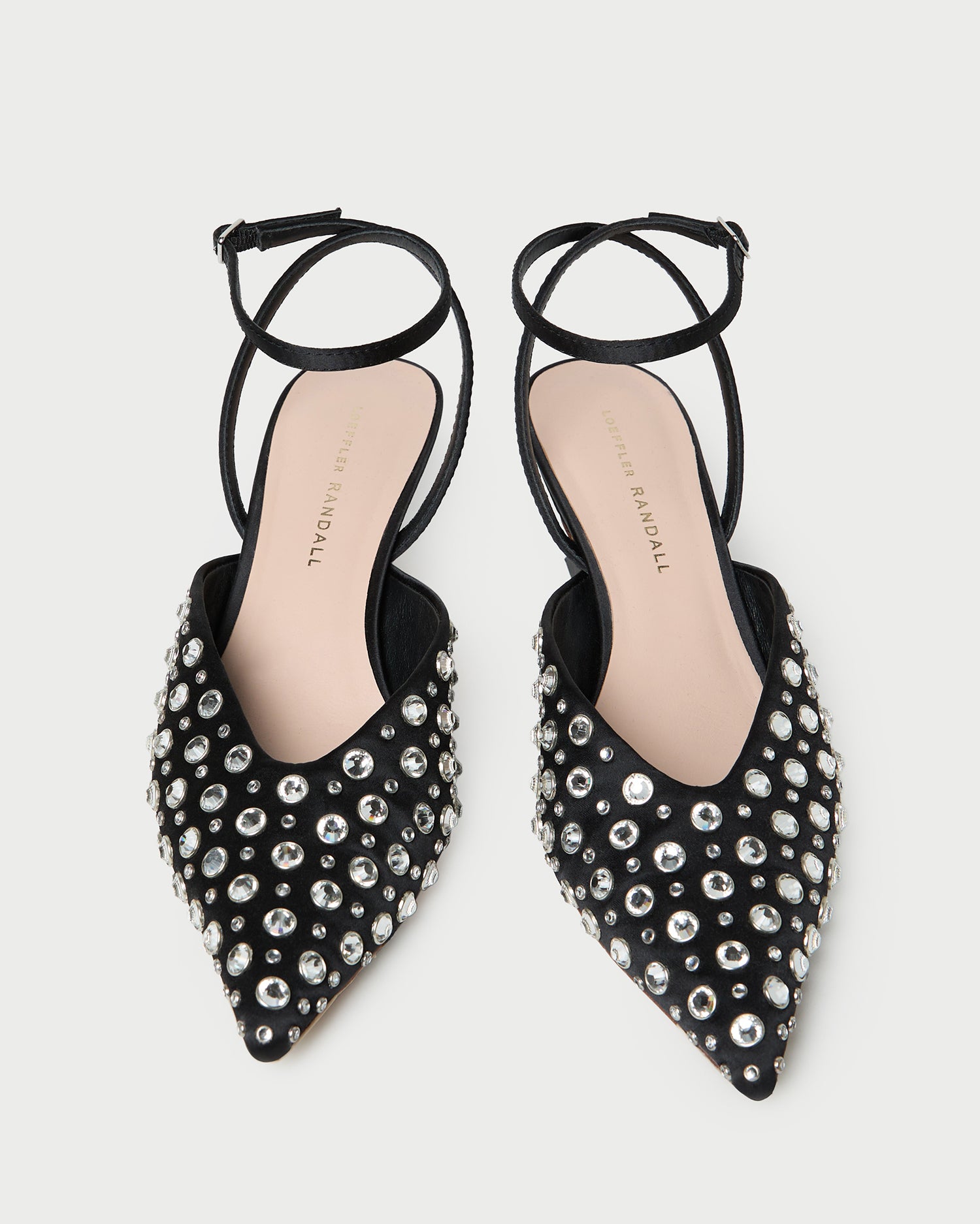 Rio Black/Crystal Kitten Heel in black satin with crystal accent.