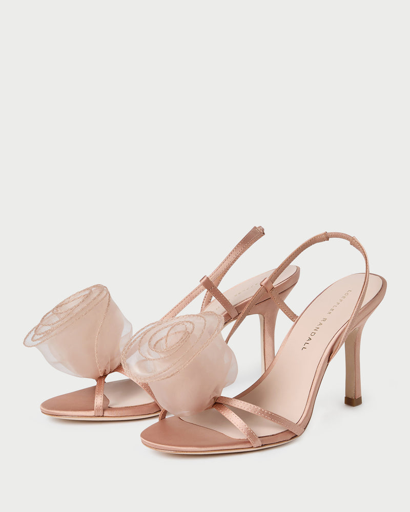 High-heel sandal in blush organza. Features a statement rose detail, an open toe, and a padded footbed with a gold-stamped logo. 3.5-inch heel.