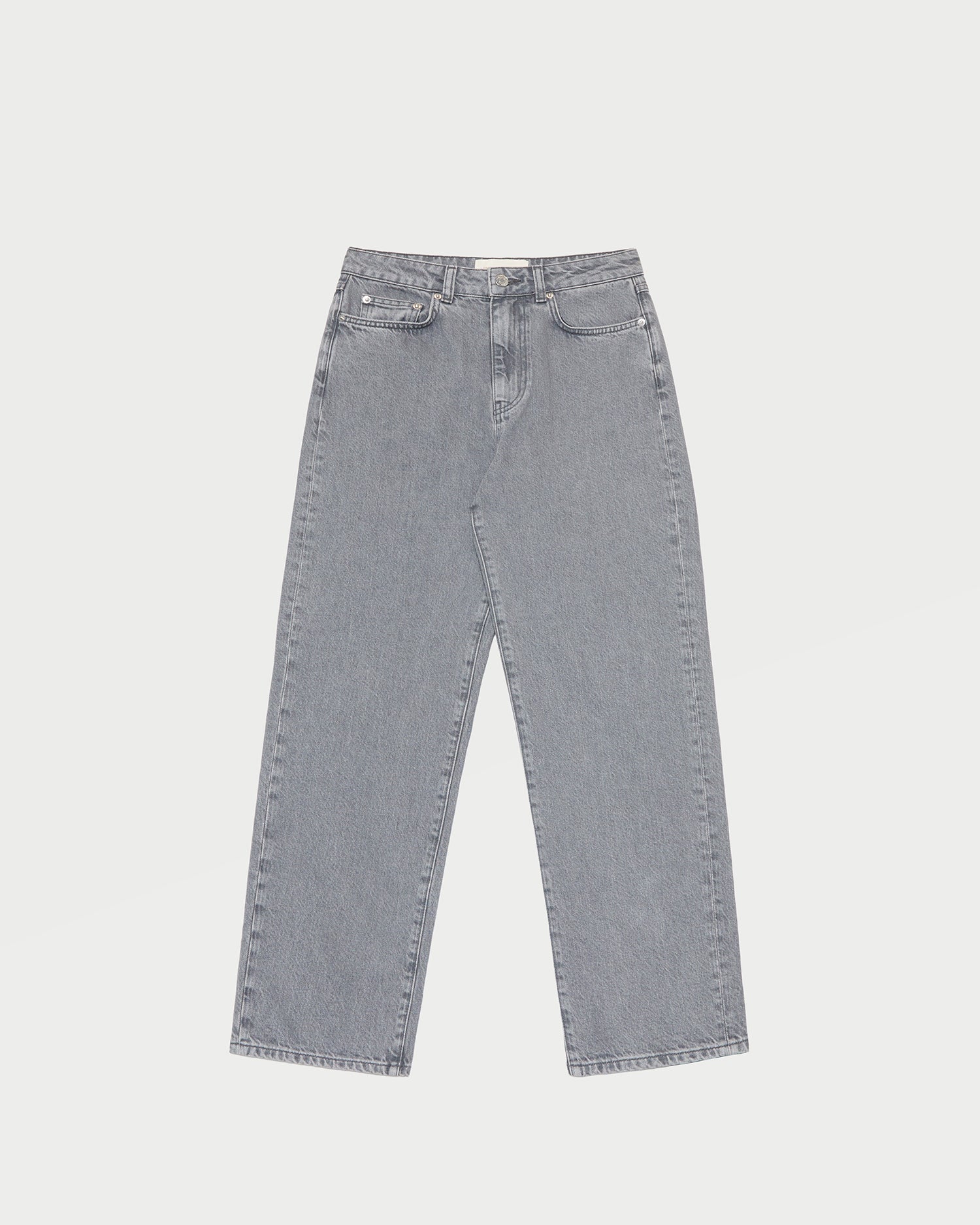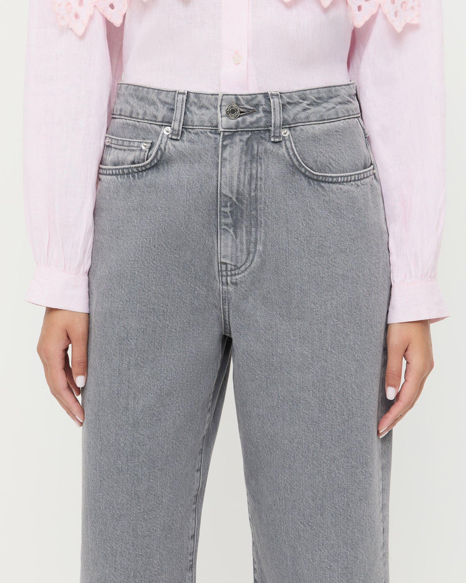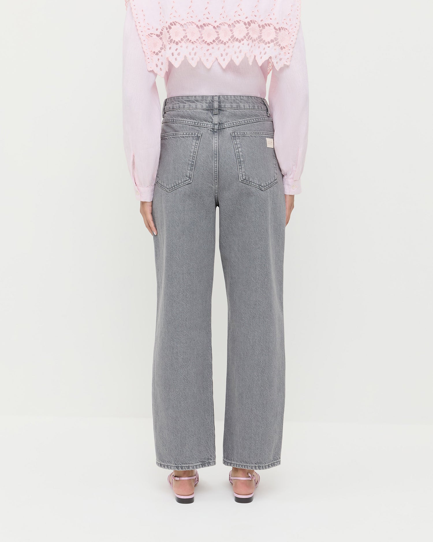 Straight pant in grey denim. Features a high waist, side and back pockets, and a zippered fly with a top button closure.