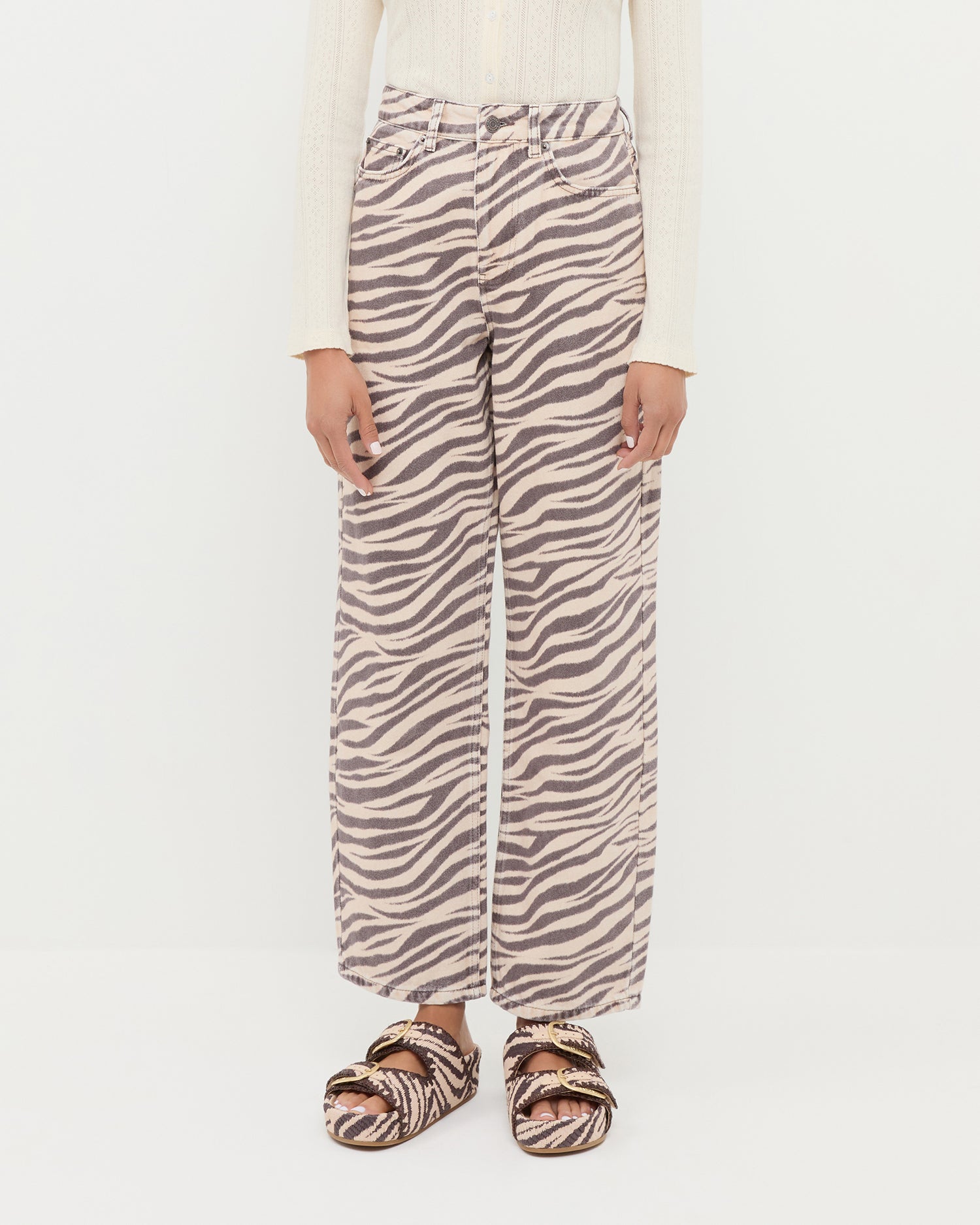 Winona Denim Pant in straight leg zebra print, Ash Cardigan in cream cotton, and Nico Zebra Two-Band Sandal.